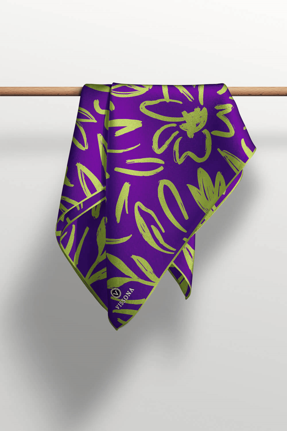 % 57 İPEK % 43 VİSKON Twill İpek Büyük Çiçek Desenli Mor - Haki Renkli 90x90 Eşarp Dikim Şekli : El Dikişi