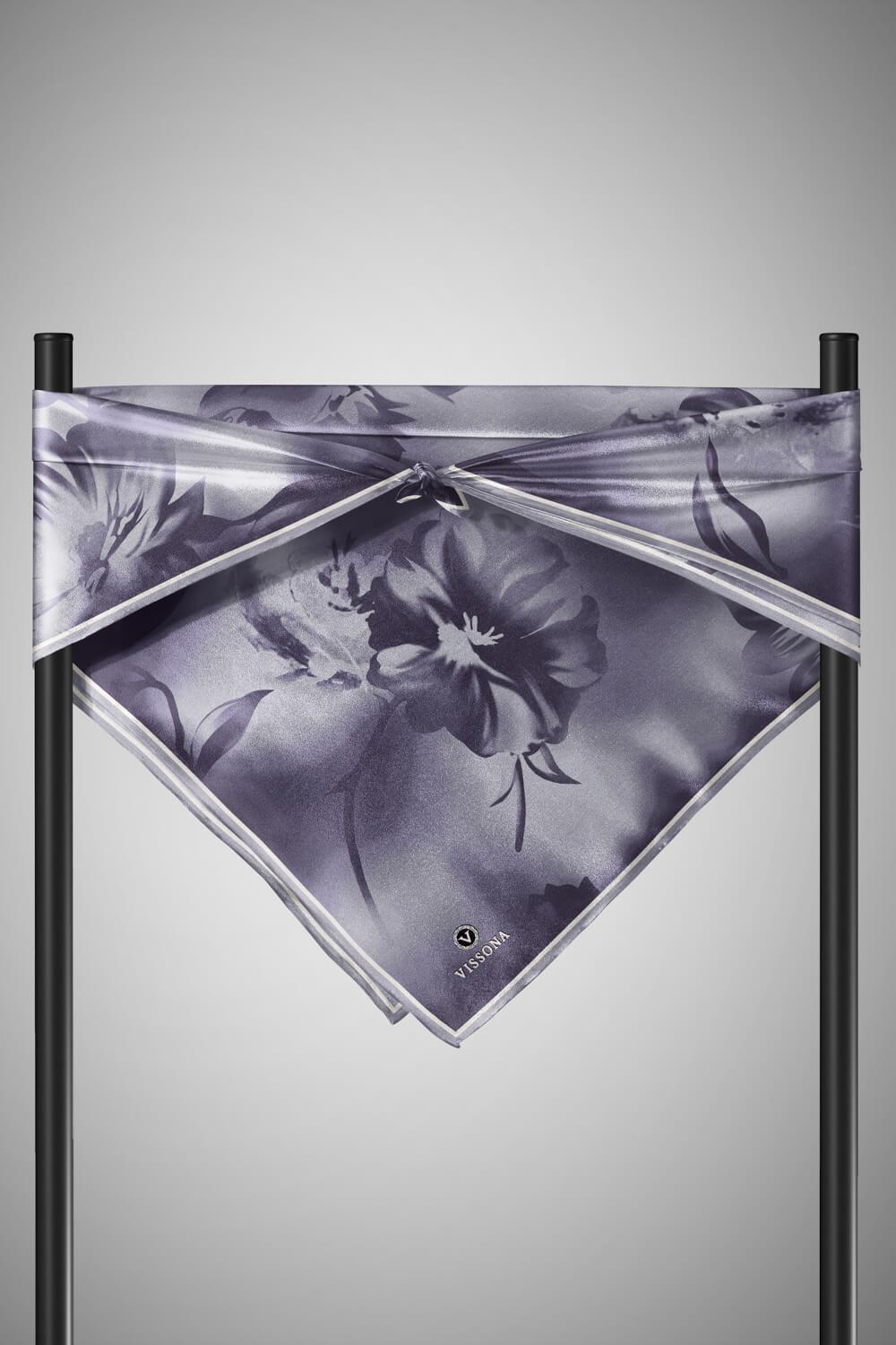 % 57 İPEK % 43 VİSKON Twill İpek Çiçek Desenli Gümüş Renkli 90x90 Dikim Şekli : El Dikişi Eşarp (6269-V5)