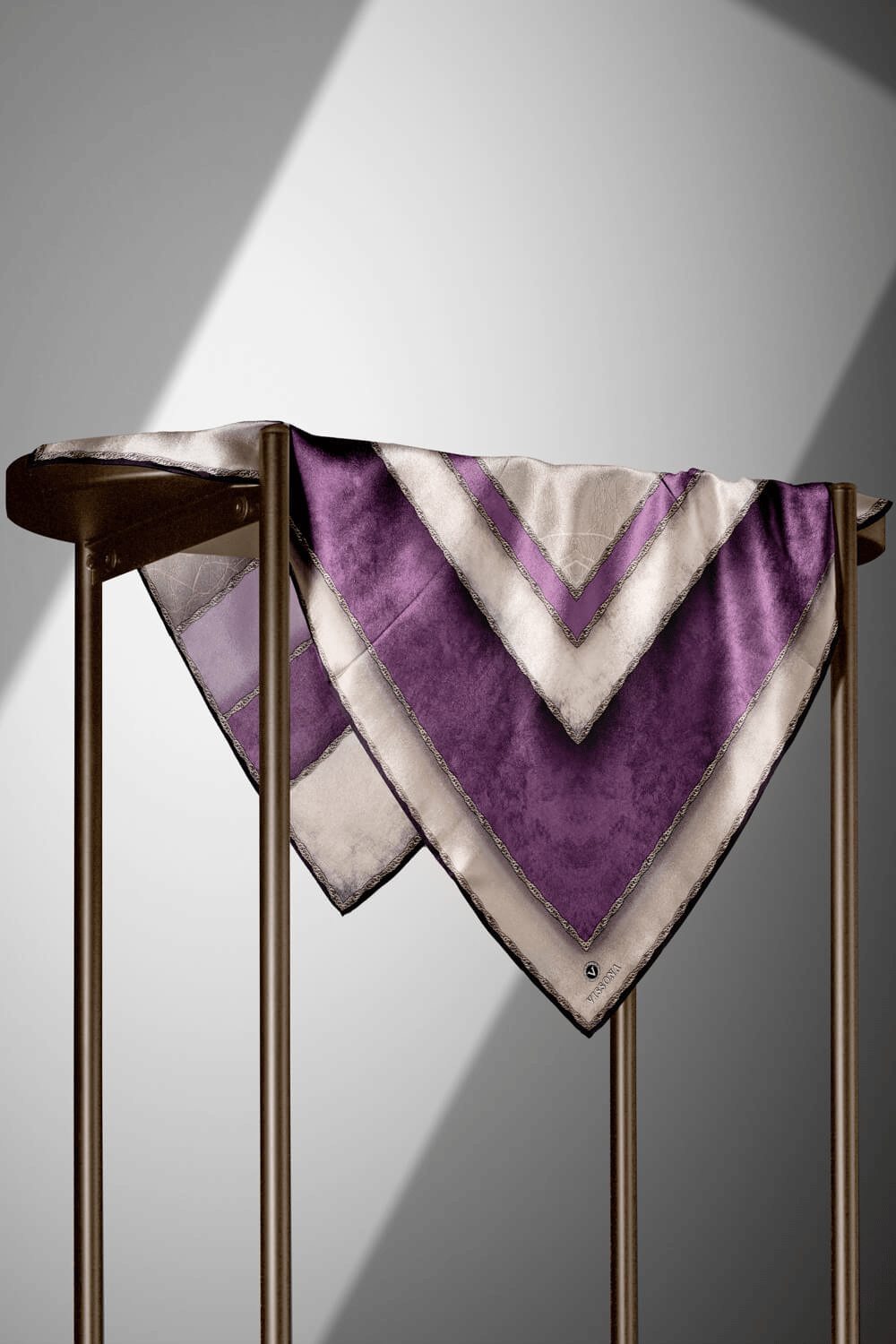 % 57 İPEK % 43 VİSKON Twill İpek Dokulu Geometrik Desenli Lila - Bej Renkli 90x90 Eşarp Dikim Şekli : El Dikişi