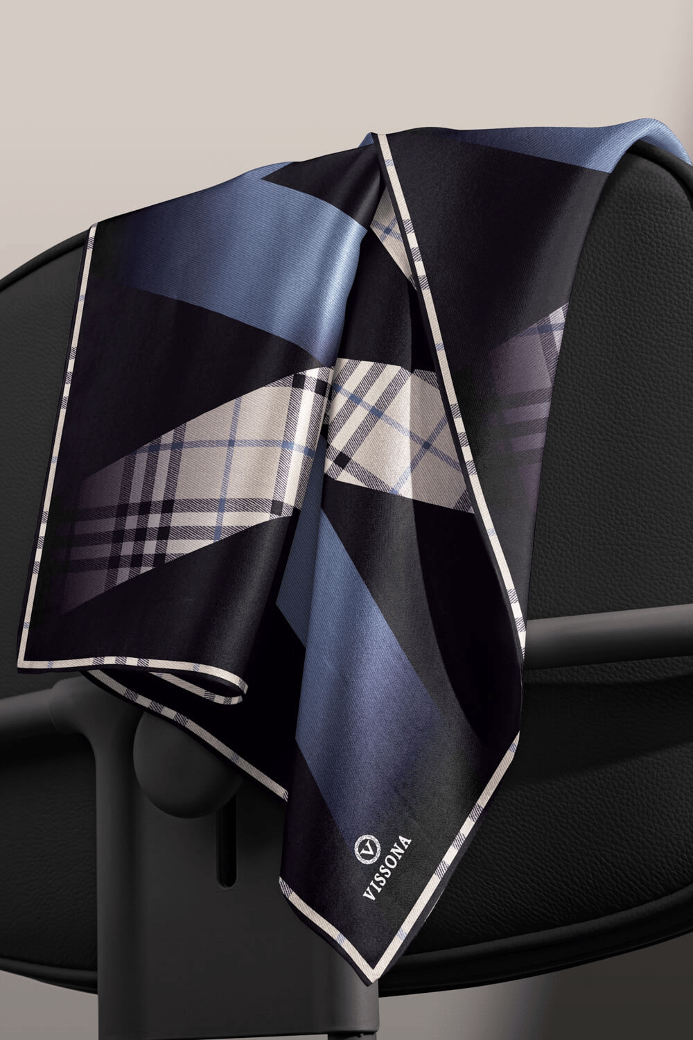 % 57 İPEK % 43 VİSKON Twill İpek Ekose Desenli İndigo - Siyah Renkli 90x90 Eşarp Dikim Şekli : El Dikişi (50581-V8)
