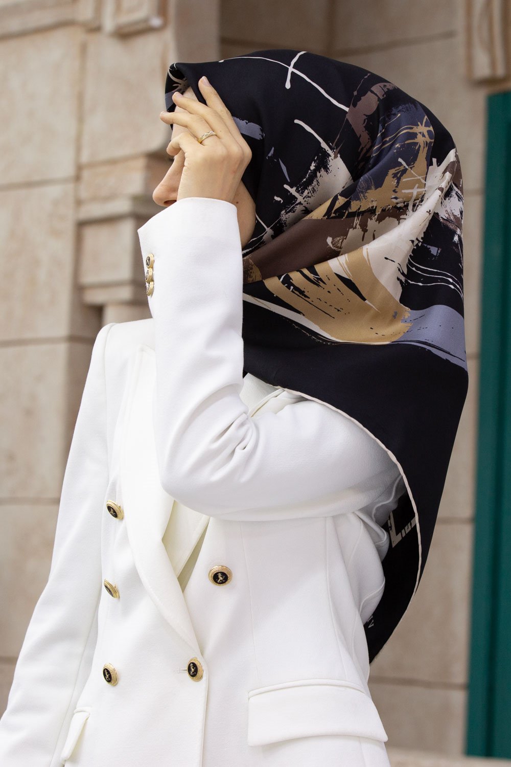 % 57 İPEK % 43 VİSKON Twill İpek Geometrik Desenli Bej - Gri Renkli 90x90 Eşarp Dikim Şekli : El Dikişi