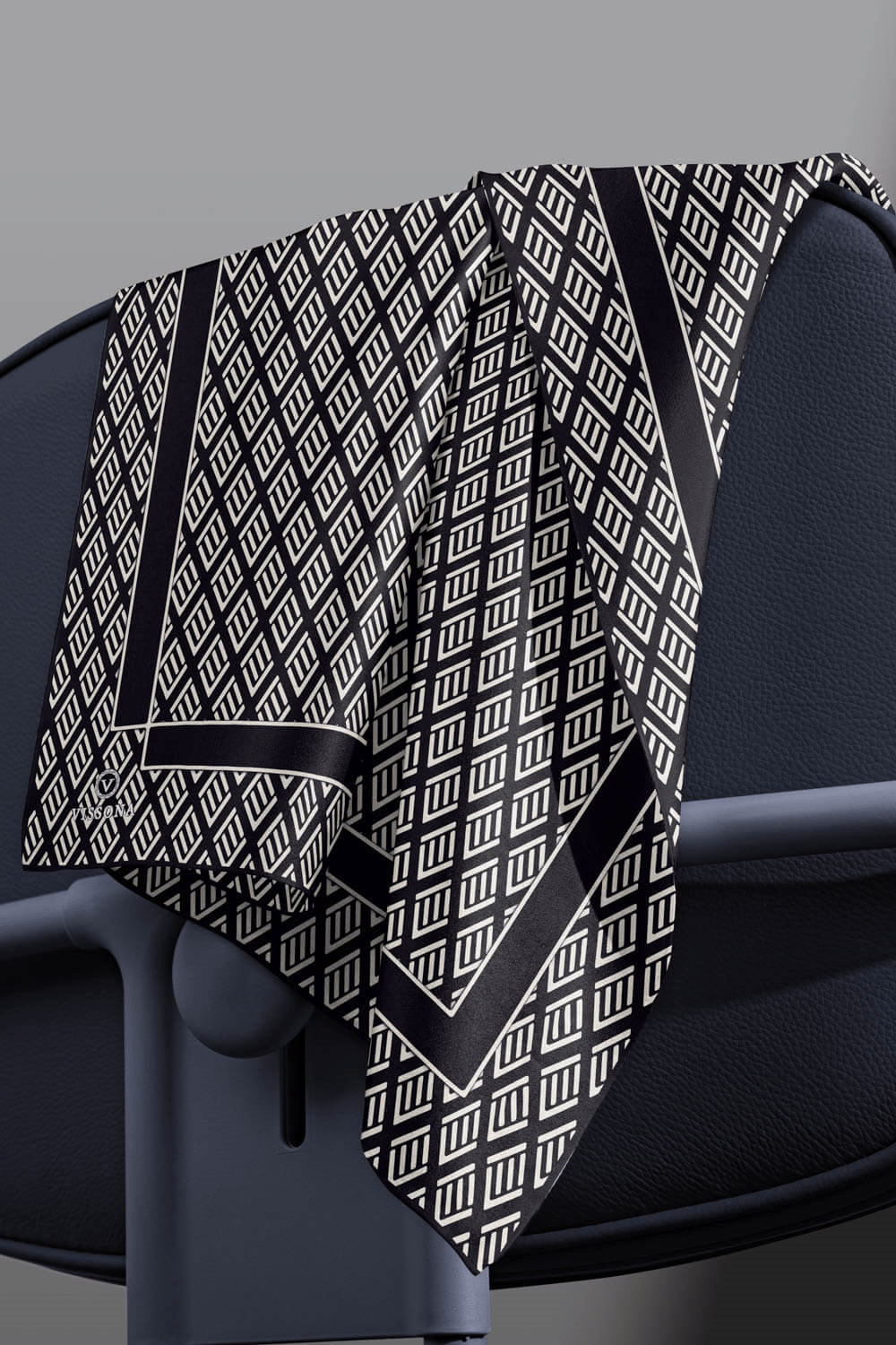 % 57 İPEK % 43 VİSKON Twill İpek Geometrik Desenli Siyah - Krem Renkli 90x90 Eşarp Dikim Şekli : El Dikişi