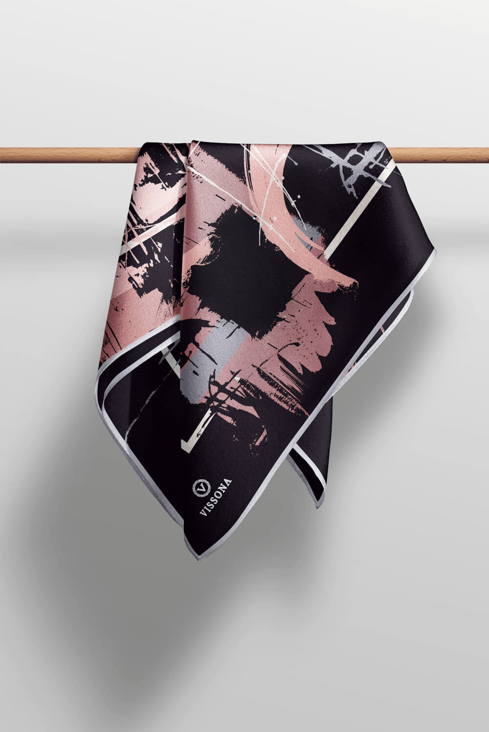% 57 İPEK % 43 VİSKON Twill İpek Geometrik Desenli Siyah - Pudra Renkli 90x90 Eşarp Dikim Şekli : El Dikişi