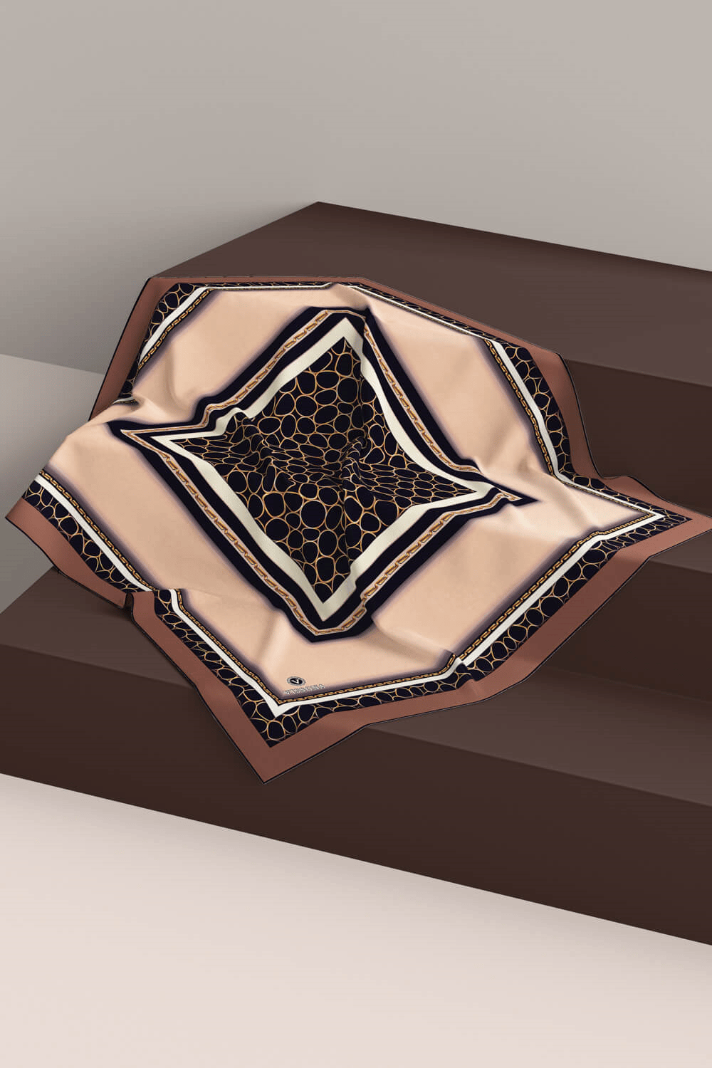 % 57 İPEK %43 VİSKON Twill İpek Gold Halka Desenli Bej - Kahverengi Renkli 90x90 Eşarp Dikim Şekli : El Dikişi