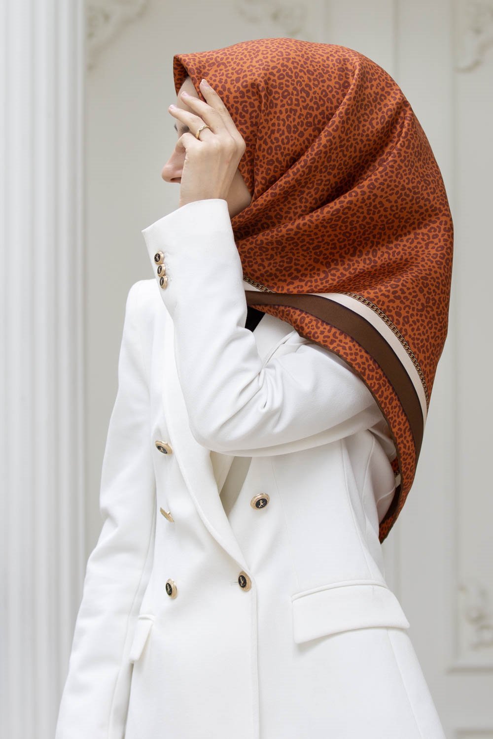 % 57 İPEK % 43 VİSKON Twill İpek Leopar Desenli Taba - Kahverengi Renkli 90x90 Eşarp Dikim Şekli : El Dikişi