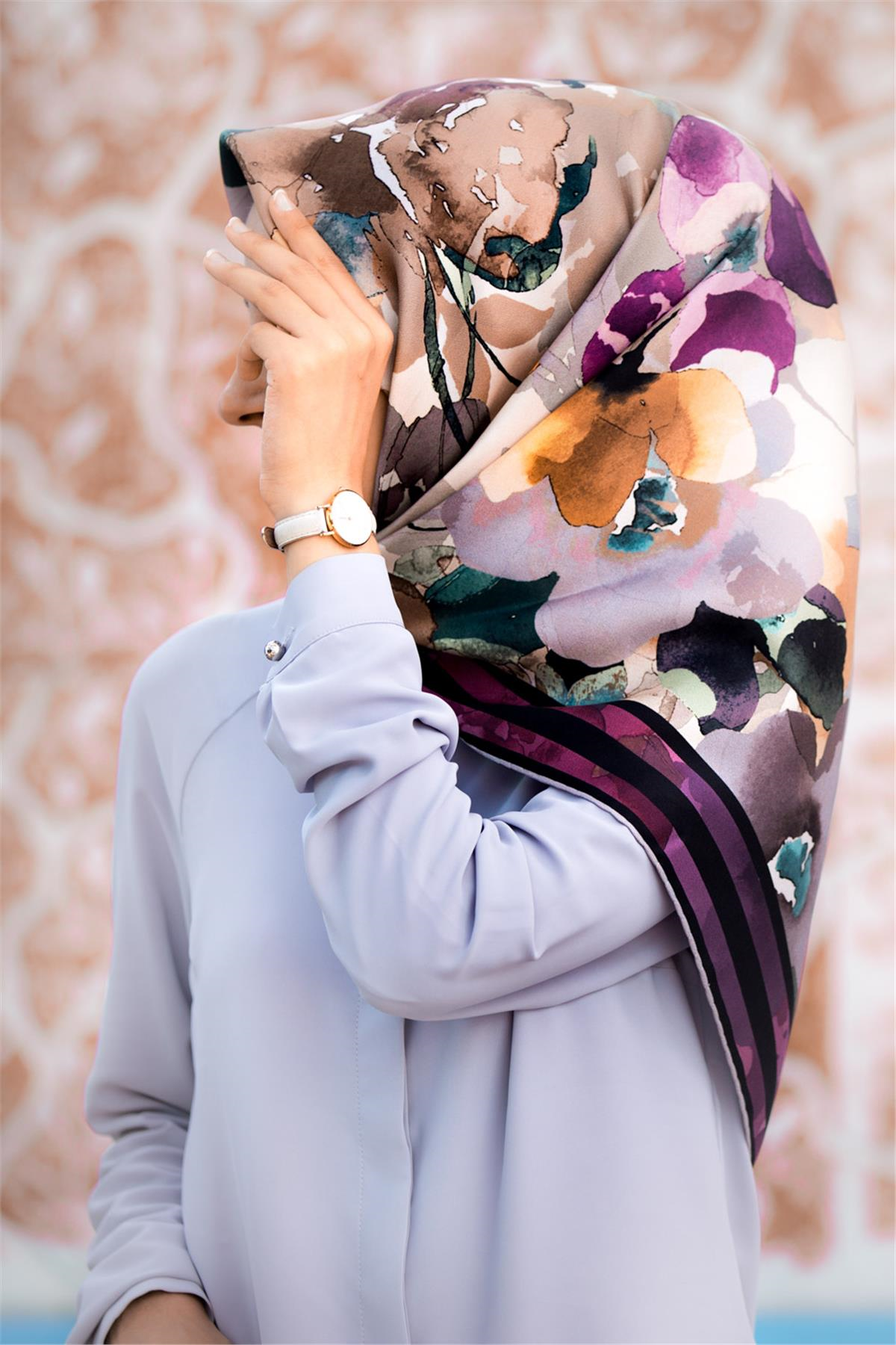 % 57 İPEK % 43 VİSKON Twill İpek Sulu Boyalı Çiçek Desenli Mor - Vizon Renkli 90x90 Eşarp Dikim Şekli : El Dikişi