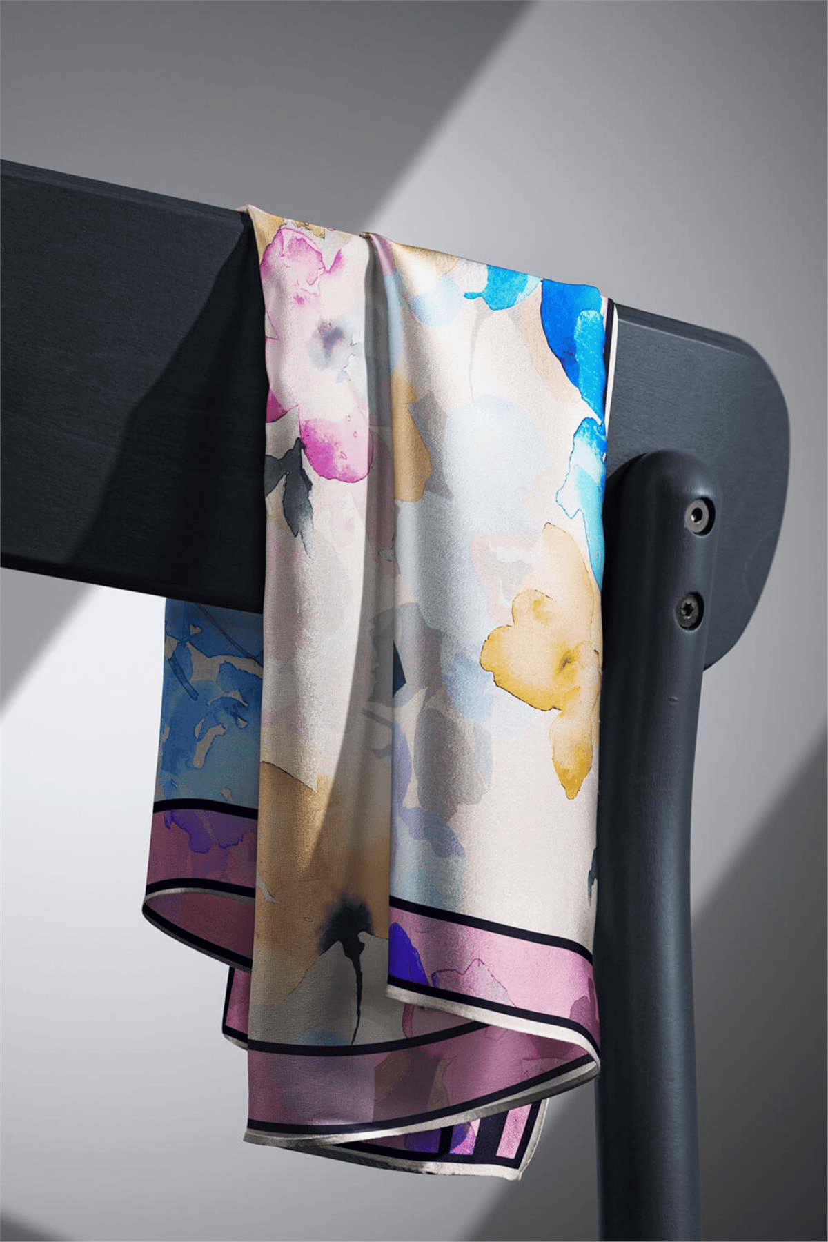 % 57 İPEK % 43 VİSKON Twill İpek Sulu Boyalı Çiçek Desenli Pembe - Bebe Mavisi Renkli 90x90 Eşarp Dikim Şekli : El Dikişi