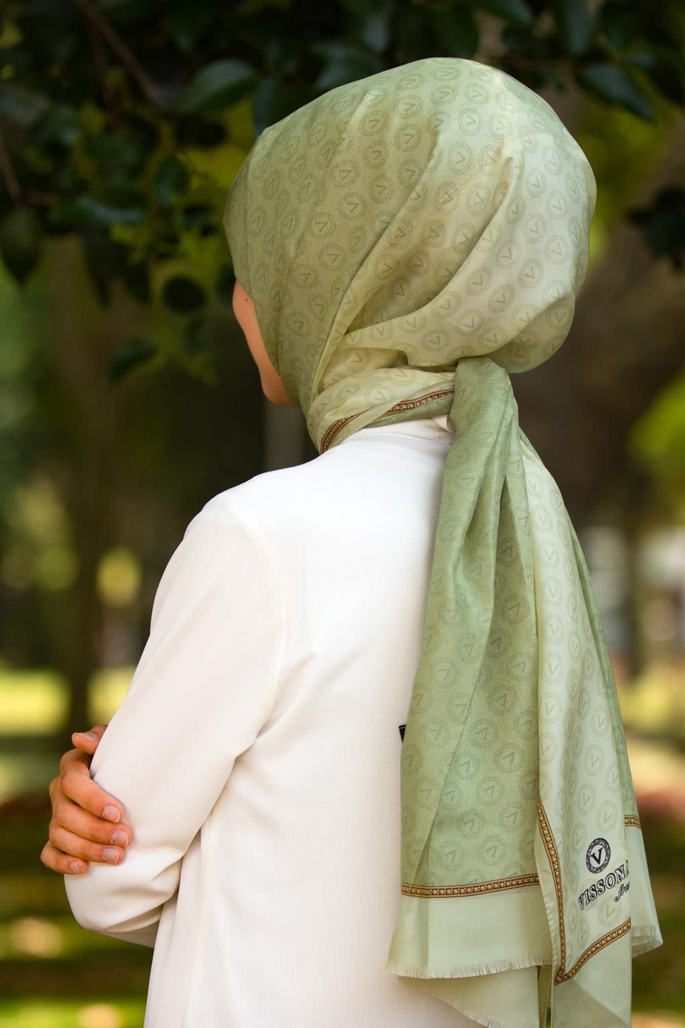 %100 İpek Degradeli Ve Monogram Desenli Fıstık Yeşili - Gold Renkli 92x210 Şal