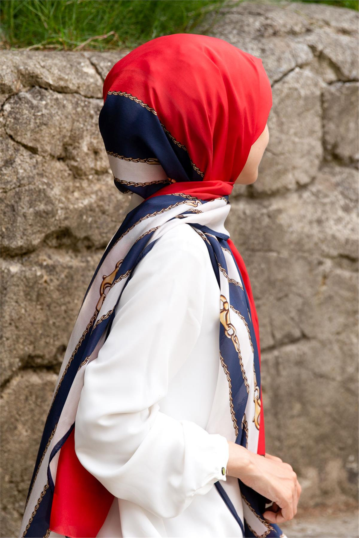 %100 İpek Geometrik Desenli Lacivert - Kırmızı Renkli 92x210 Şal (10551-9)