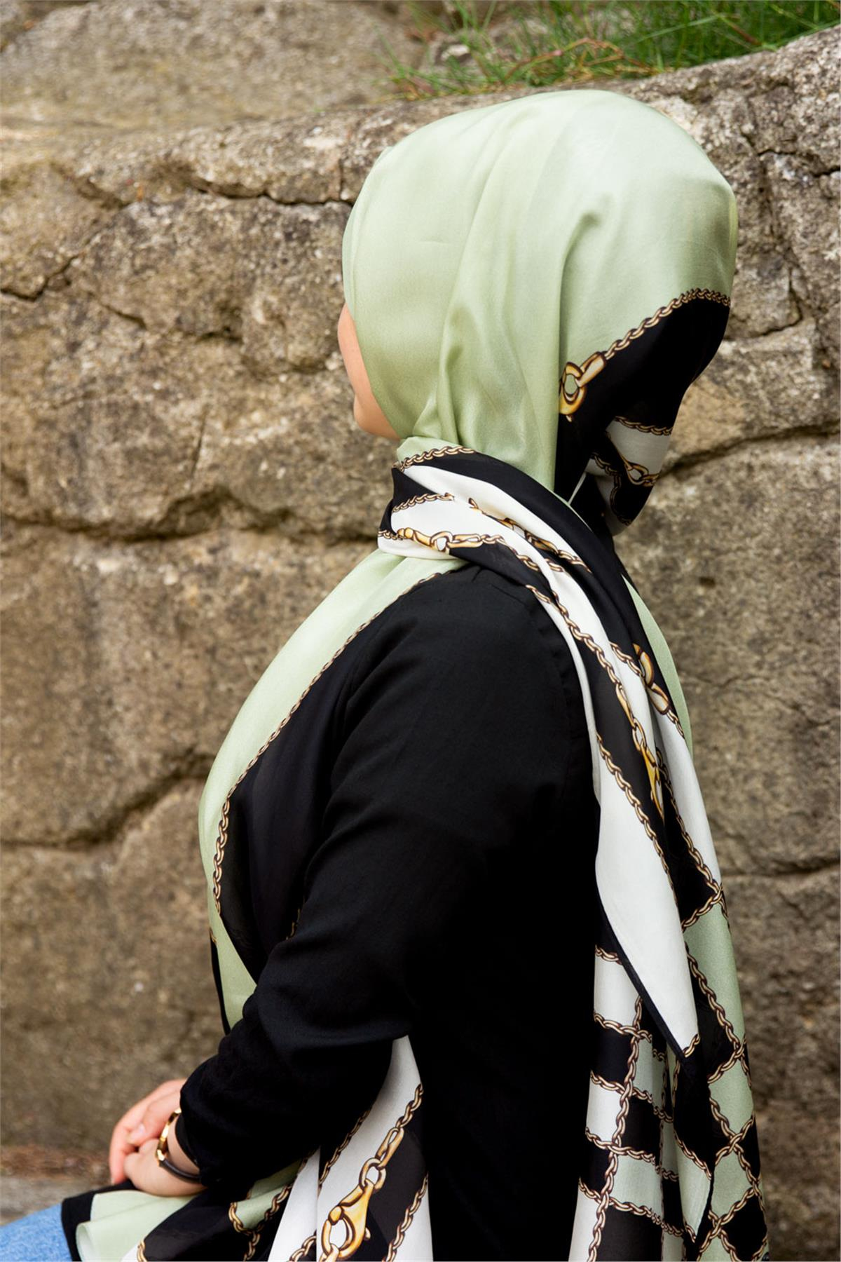 %100 İpek Geometrik Desenli Siyah - Fıstık Yeşili Renkli 92x210 Şal