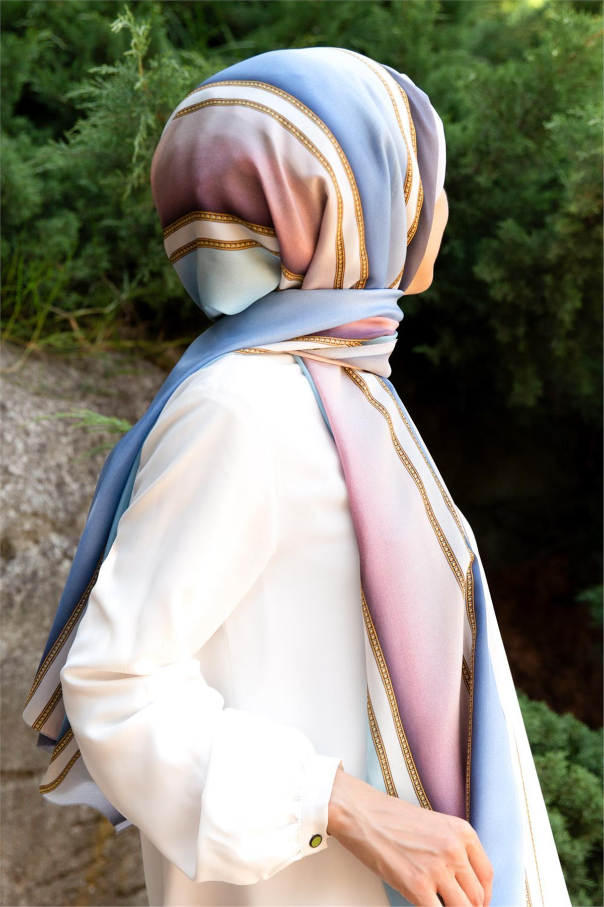 %100 İpek Şerit Desenli Bebe Mavisi - Pudra Renkli 92x210 Şal