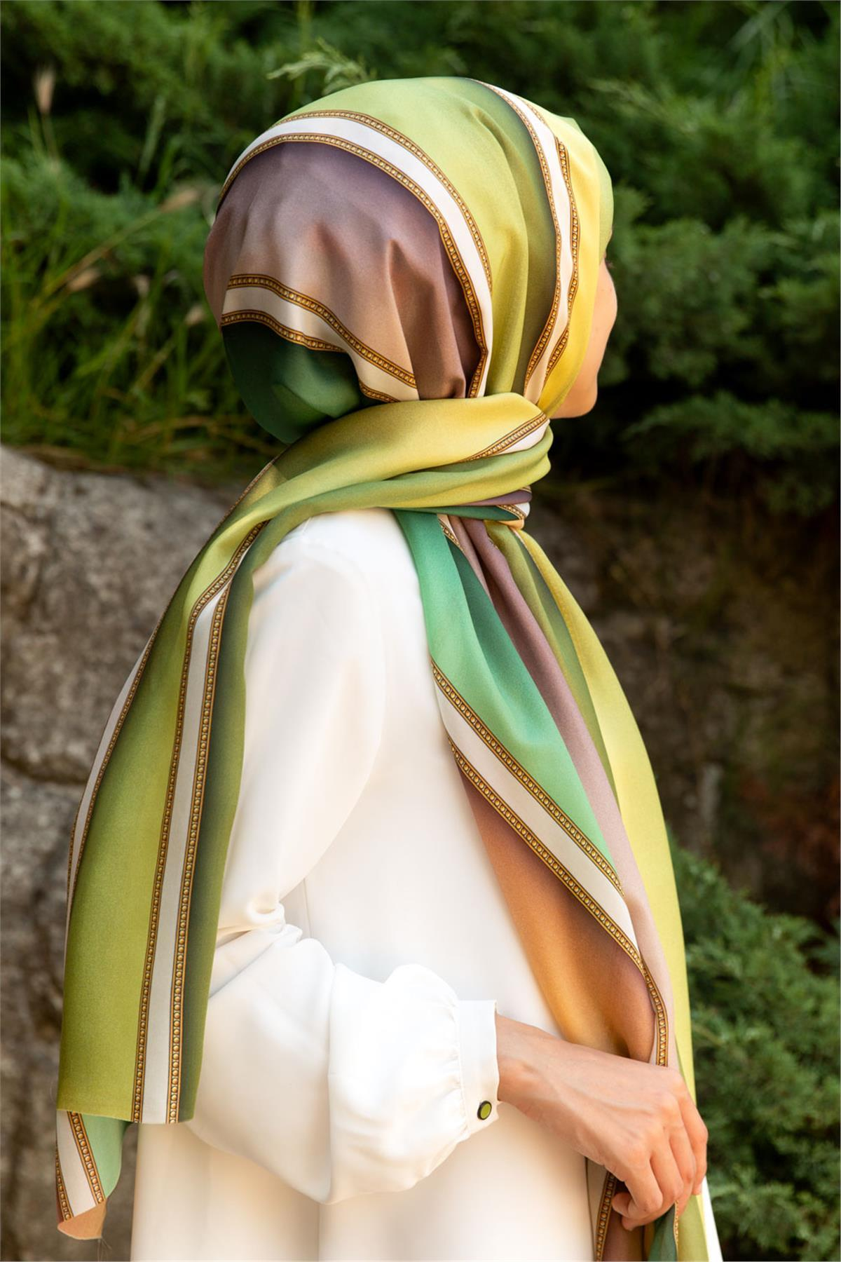 %100 İpek Şerit Desenli Gold - Mint Yeşili Renkli 92x210 Şal