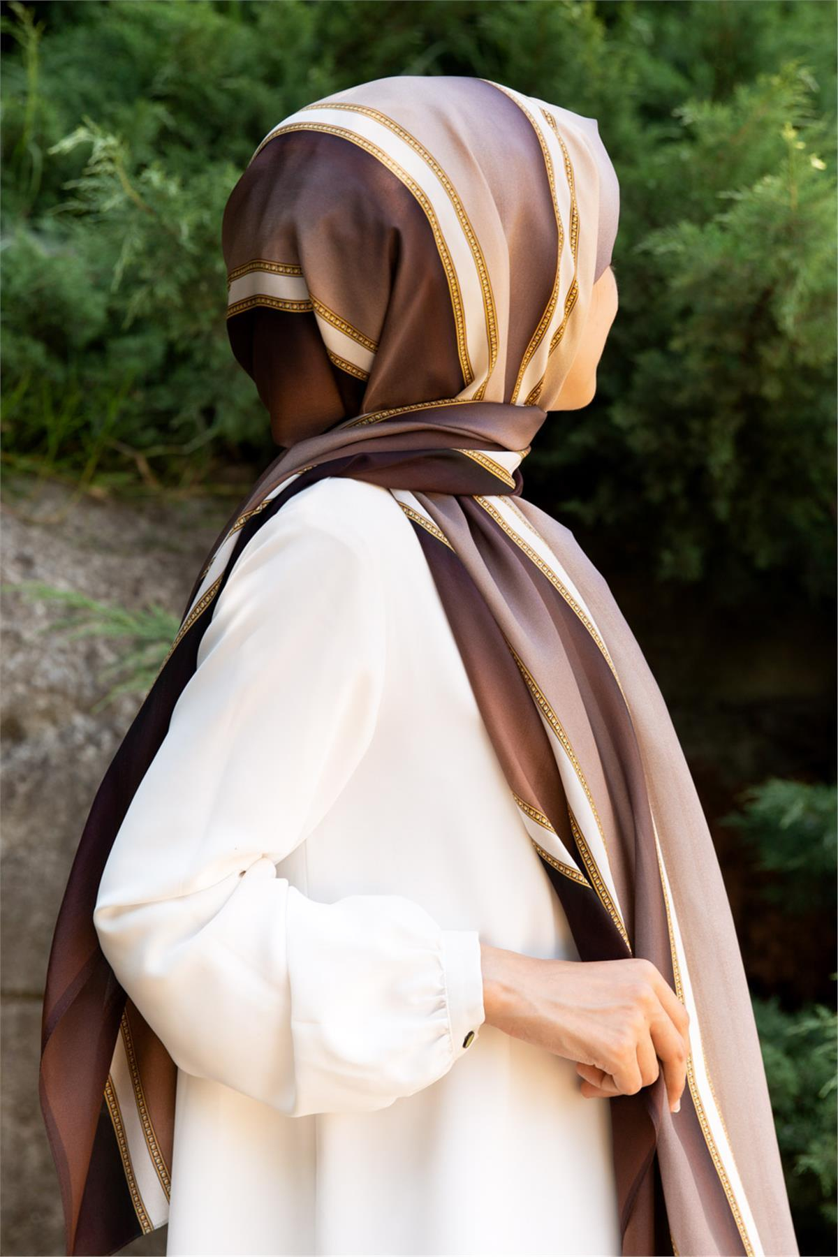 %100 İpek Şerit Desenli Krem - Vizon Renkli 92x210 Şal