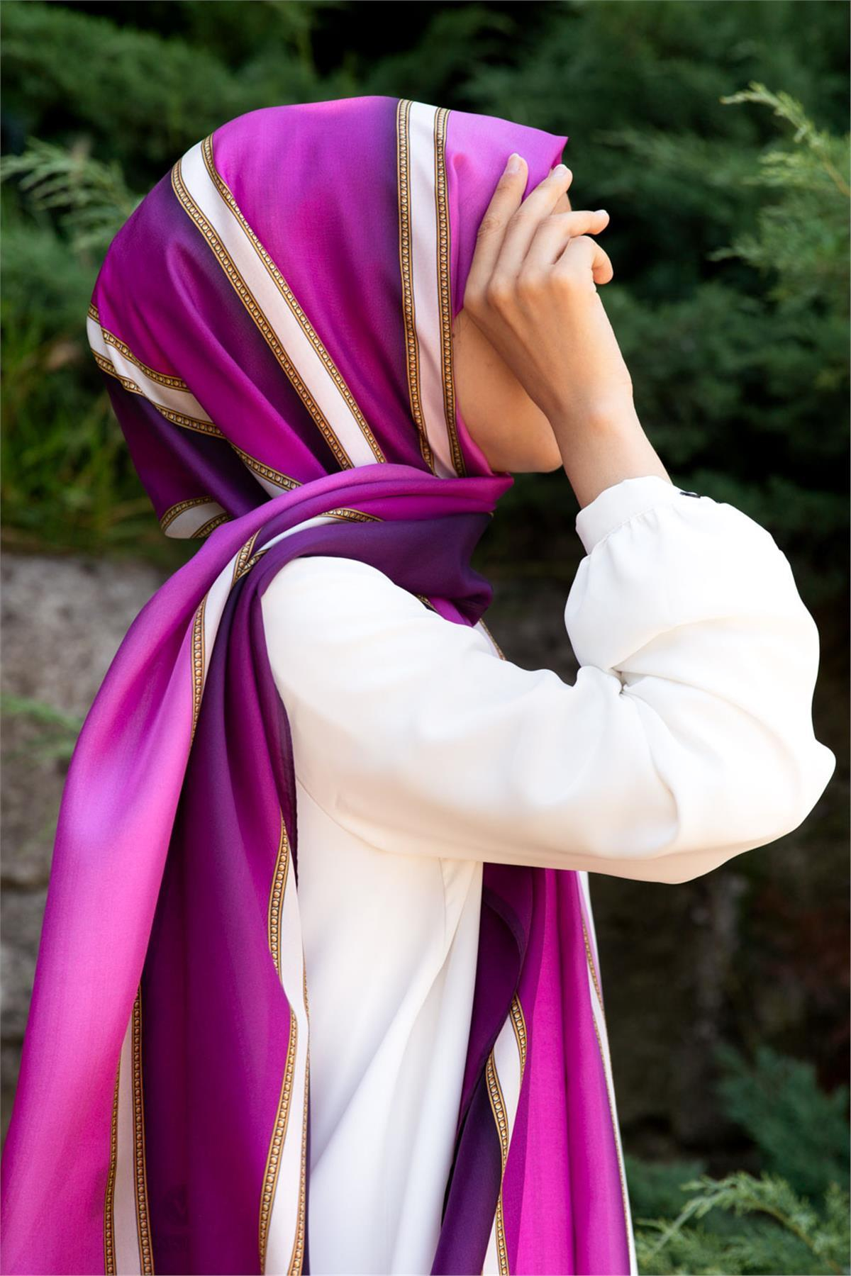 %100 İpek Şerit Desenli Mürdüm - Krem Renkli 92x210 Şal