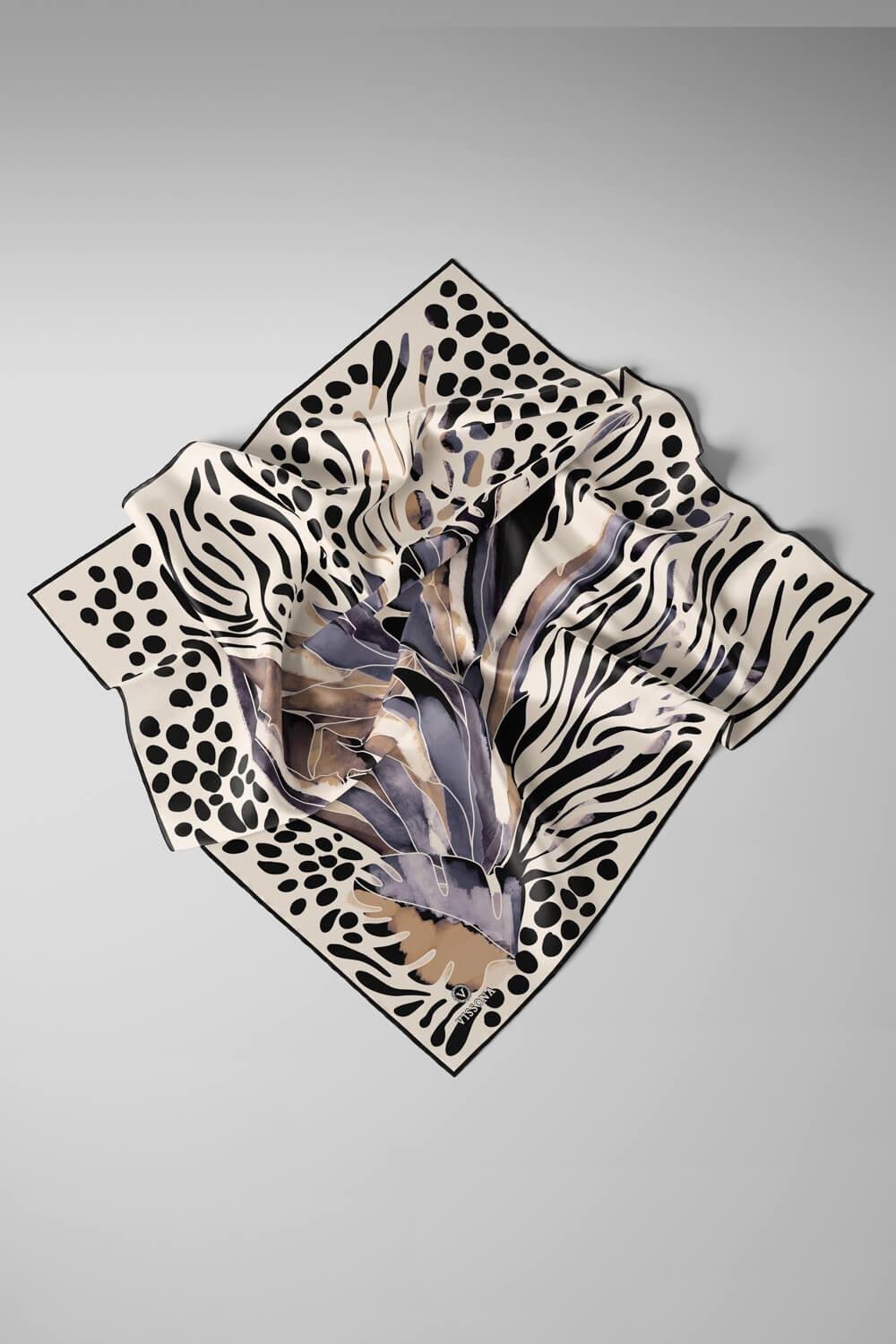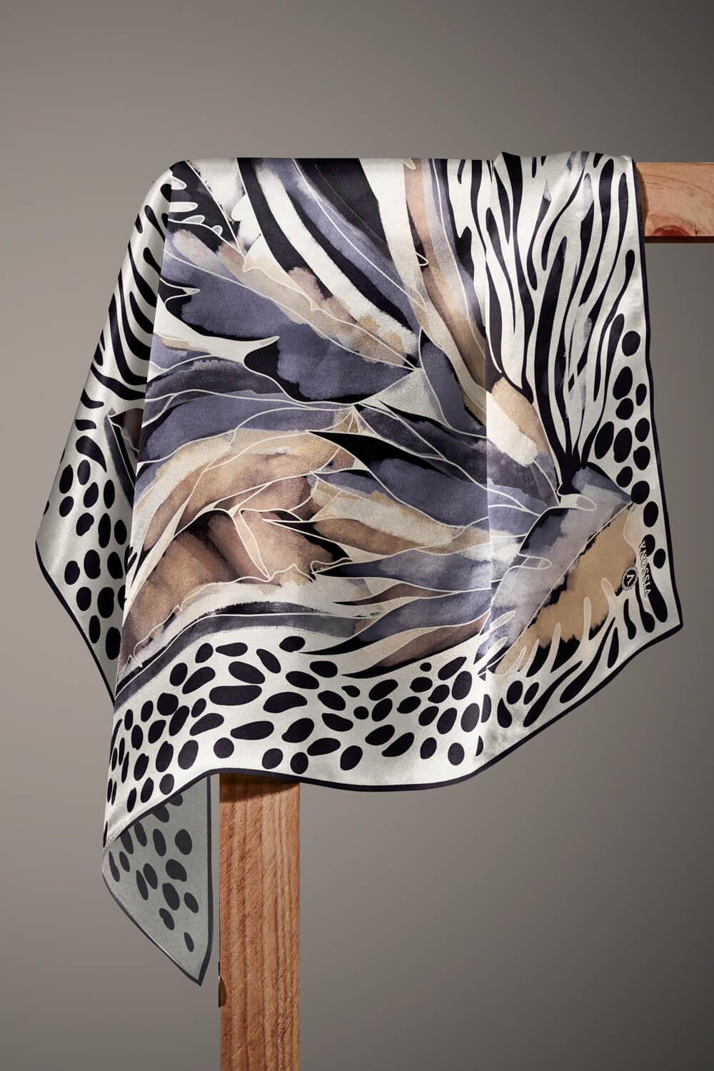 %100 Twill İpek Amazon Desenli Gri- Bej Renkli 90x90 Eşarp Kenar Dikiş Şekli El Dikişli