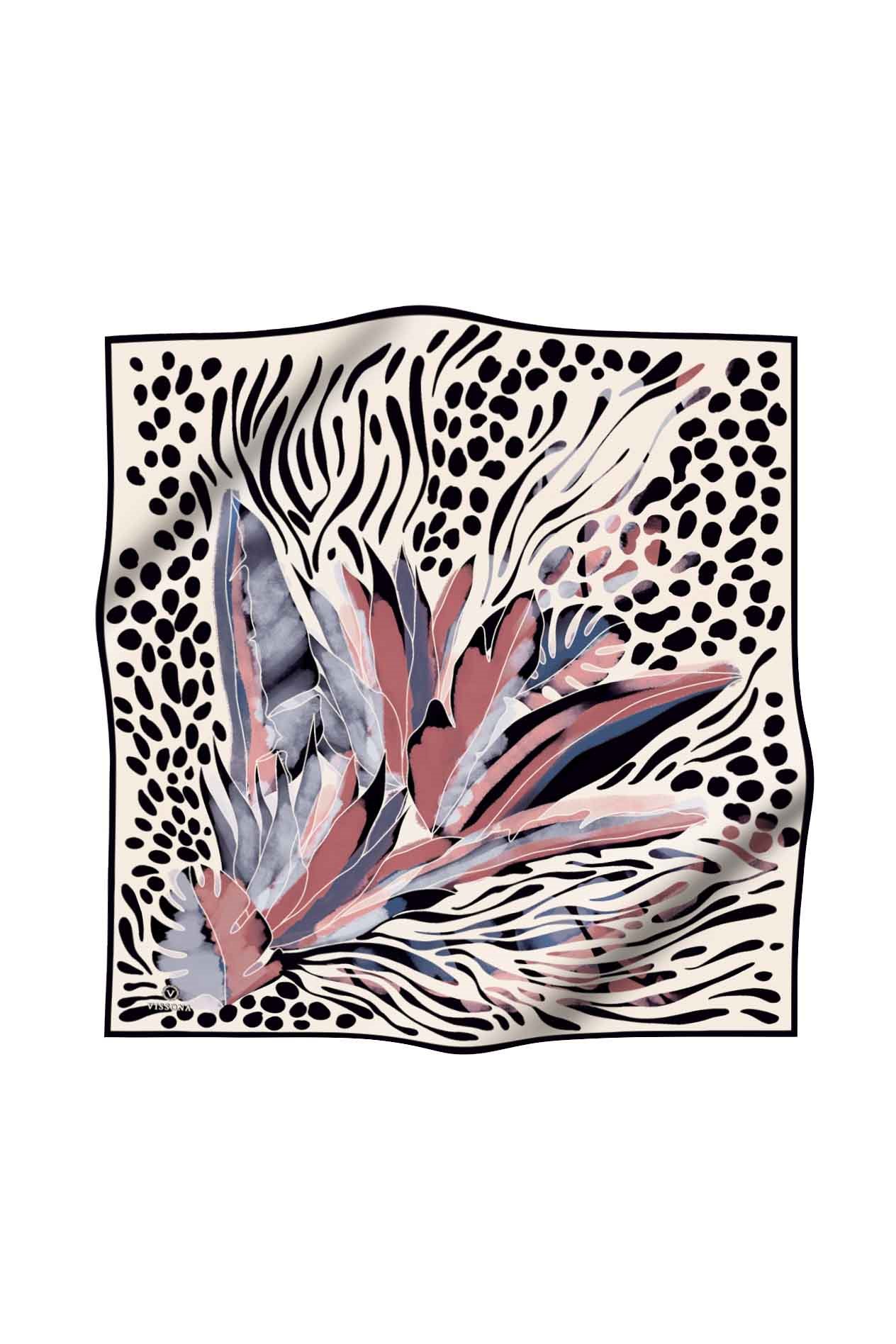 %100 Twill İpek Amazon Desenli Pudra - Gri Renkli 90x90 Eşarp Kenar Dikiş Şekli El Dikişli
