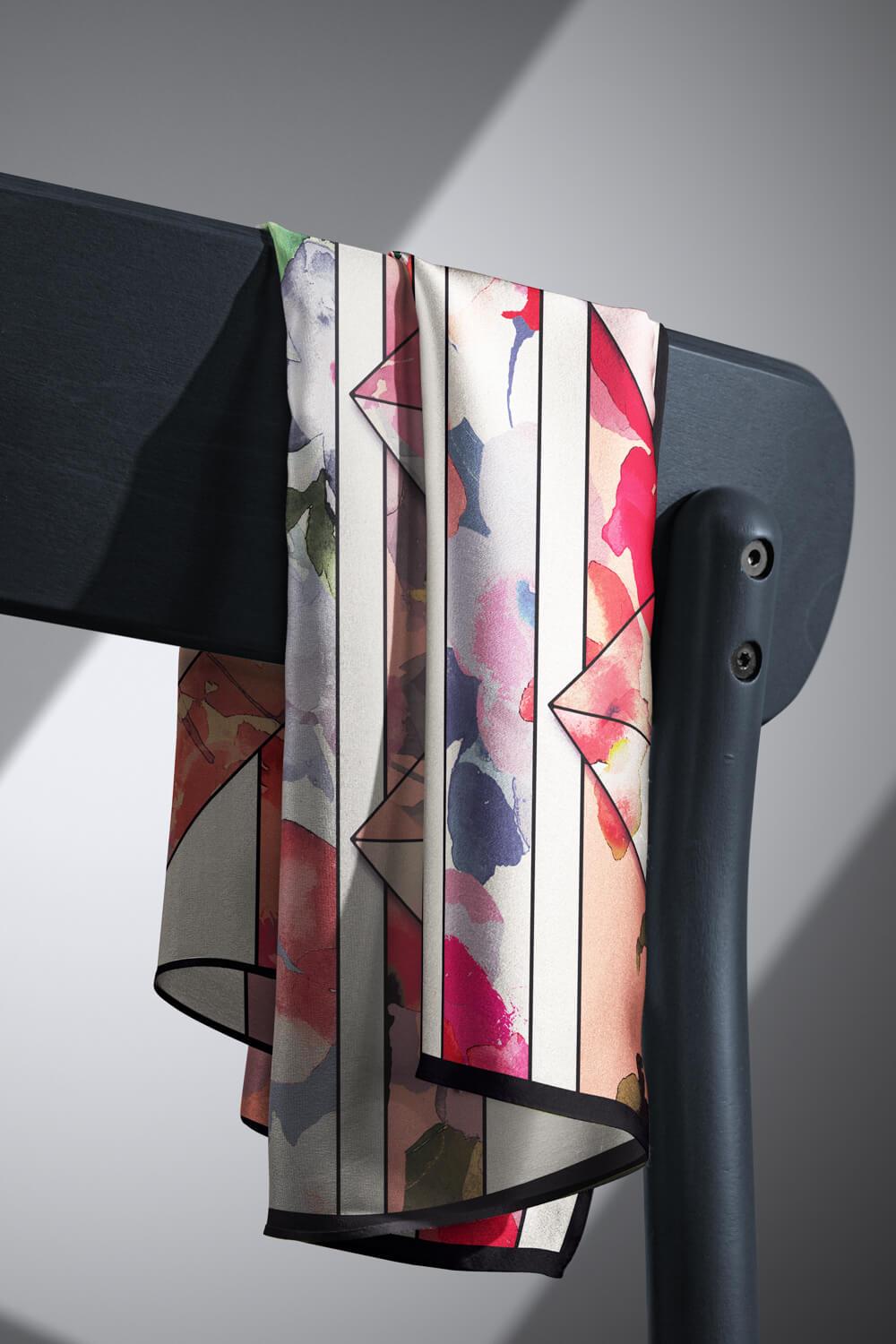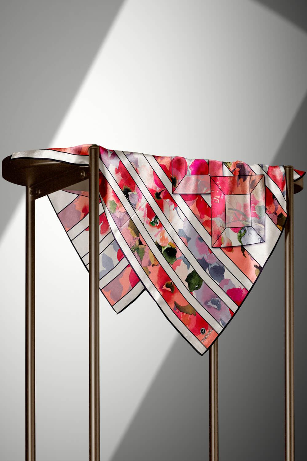 %100 Twill İpek Bahar Çiçekleri Desenli Gri - Kırmızı Renkli 90x90 Eşarp Kenar Dikiş Şekli El Dikişli
