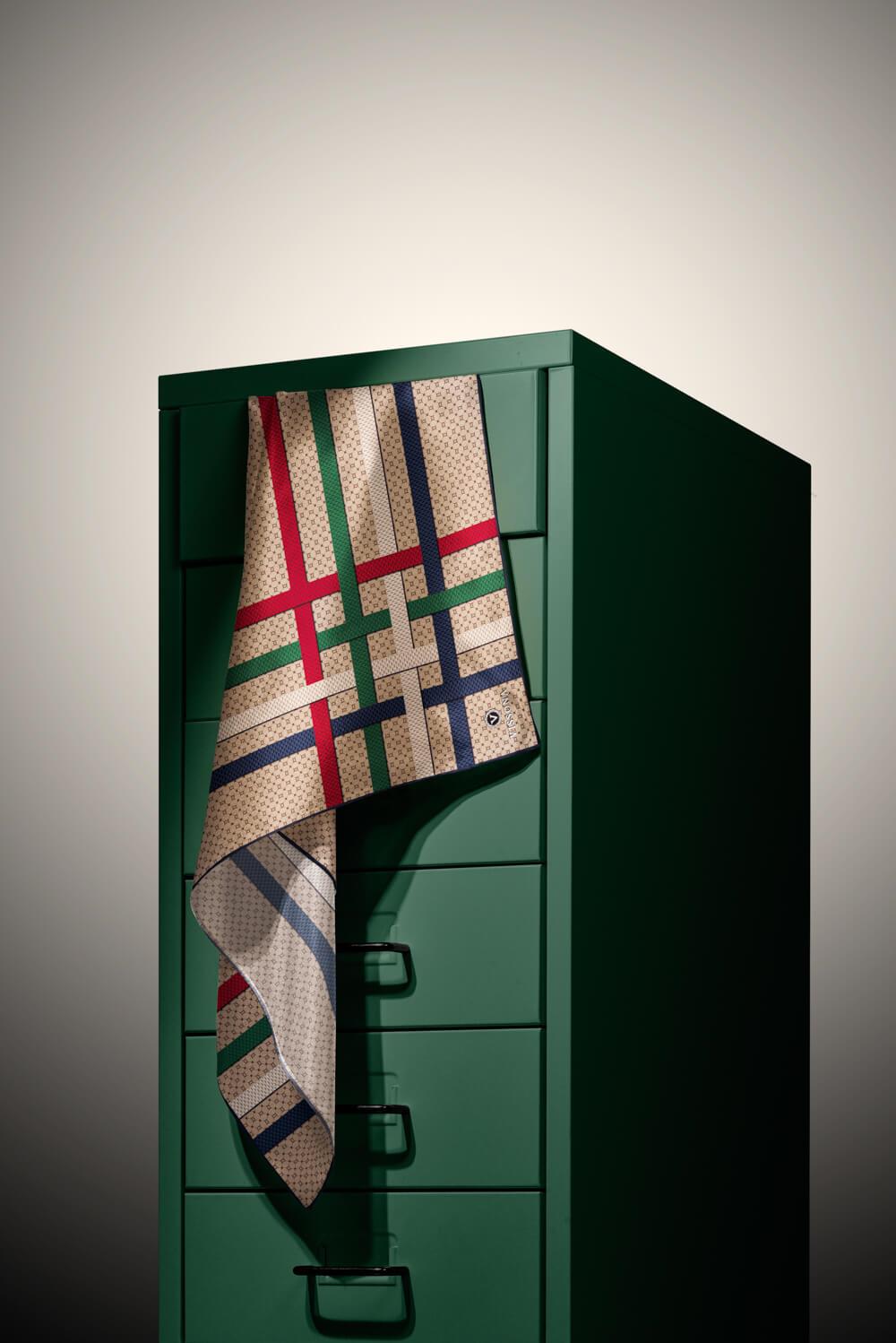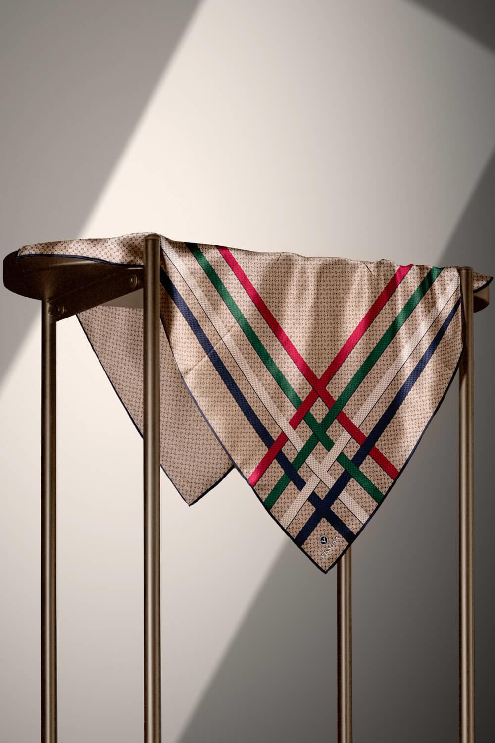 %100 Twill İpek Bantlı Monogram Desenli Bej - Lacivert Renkli 90x90 Eşarp Dikim Şekli : El Dikişi