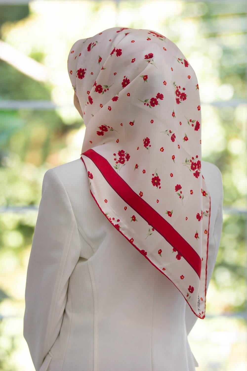 100% Twill İpek Bordürlü Çıtır Çiçek Desenli Kırmızı Renkli 90x90 Dikim Şekli : El Dikişi Eşarp