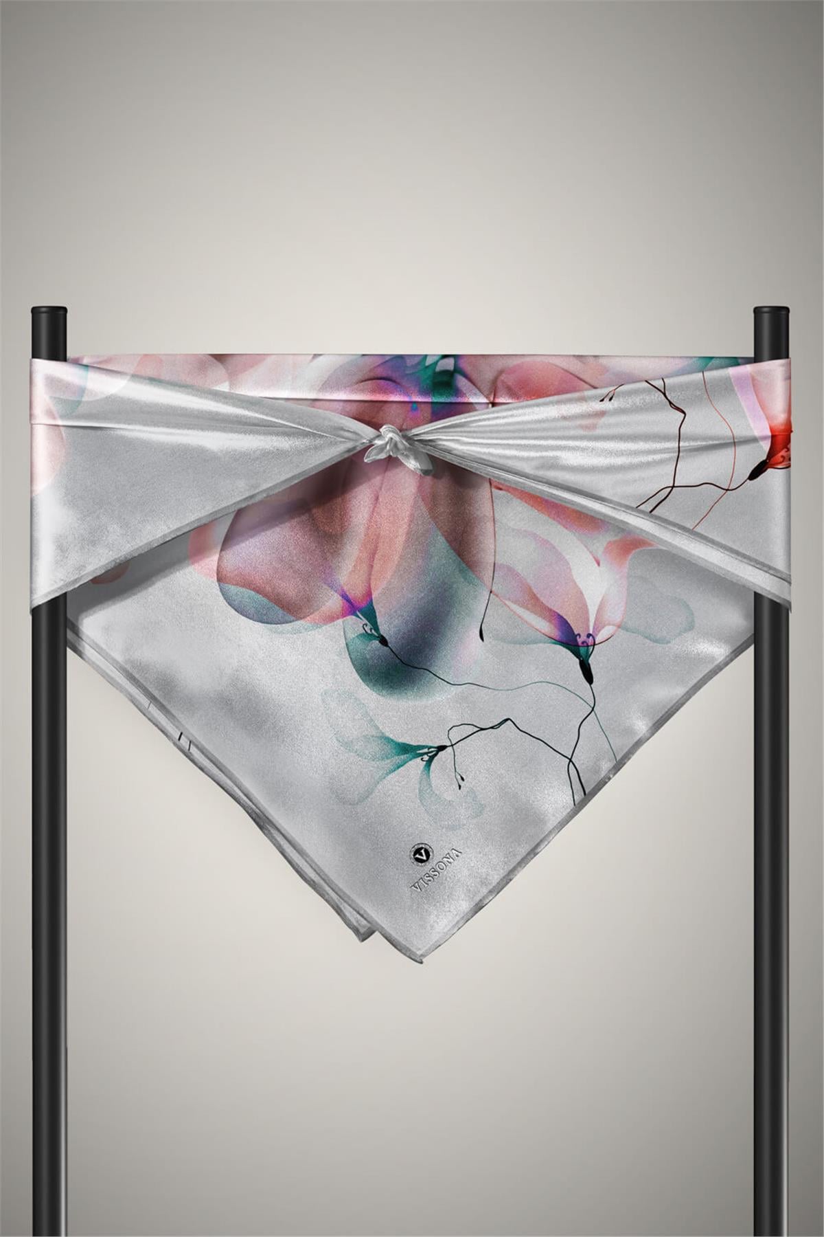 %100 Twill İpek Büyük Çiçek Desenli Gri - Somon Renkli 90x90 Eşarp Dikim Şekli : El Dikişi