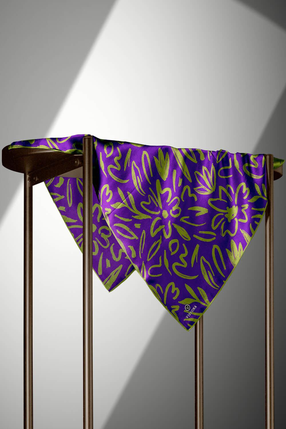 %100 Twill İpek Büyük Çiçek Desenli Mor - Haki Renkli 90x90 Eşarp Dikim Şekli : El Dikişi