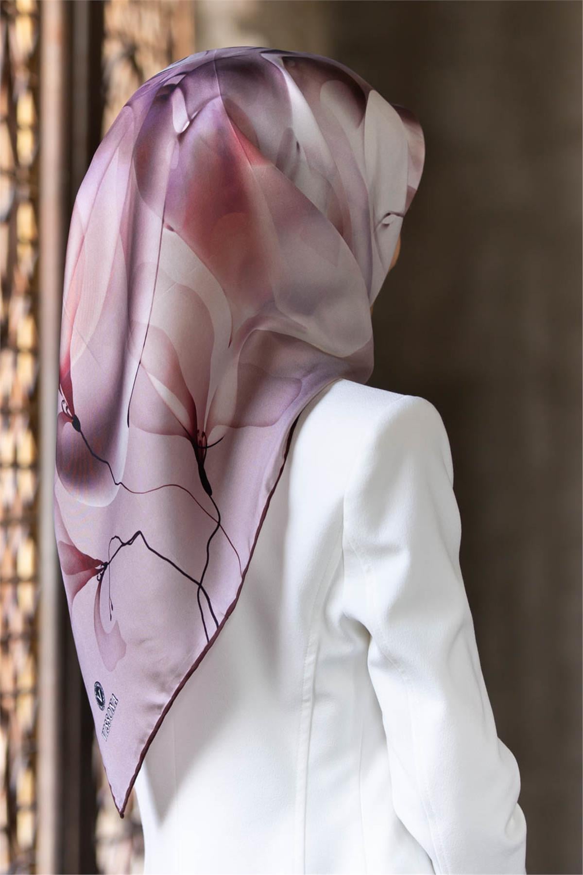 %100 Twill İpek Büyük Çiçek Desenli Pudra - Gül Kurusu Renkli 90x90 Eşarp Dikim Şekli : El Dikişi (DGN50415-4)