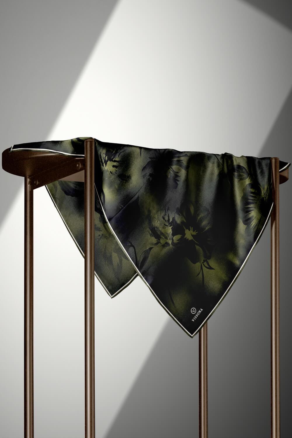 100% Twill İpek Çiçek Desenli Haki Renkli 90x90 Dikim Şekli : El Dikişi Eşarp