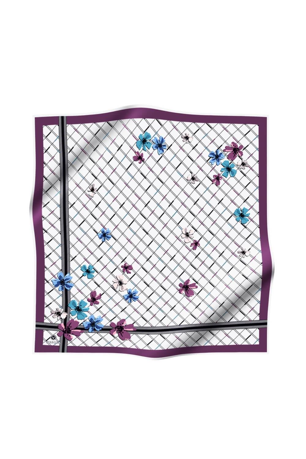 %100 Twill İpek Çıtır Çiçek Desenli Mor - Krem Renkli 90x90 Eşarp Dikim Şekli : El Dikişi (DGN50073-9)