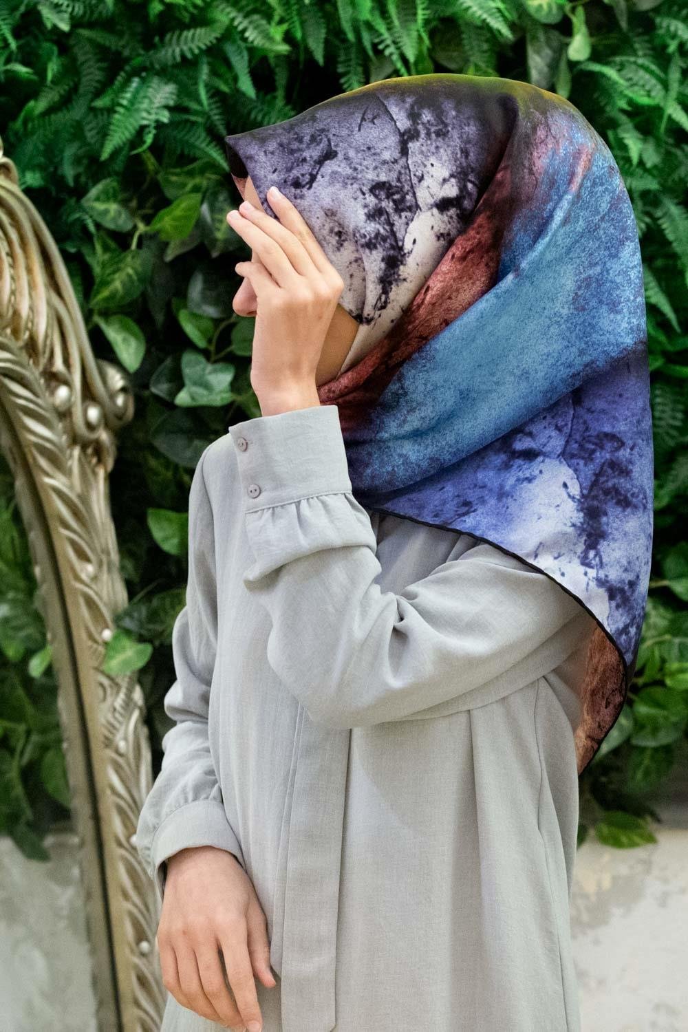 %100 Twill İpek Dokulu Ve Geometrik Desenli Gül Kurusu - İndigo Renkli 90x90 Eşarp Dikim Şekli : El Dikişi