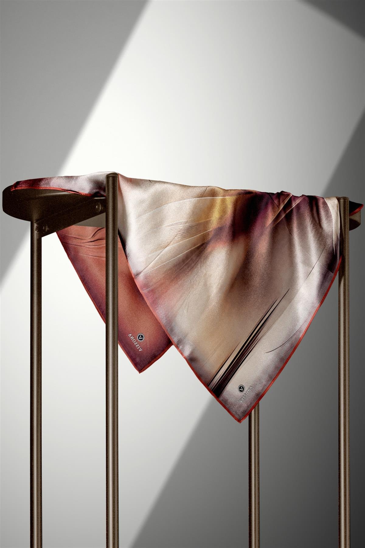 %100 Twill İpek Duman Desenli Hardal - Taba Renkli 90x90 Eşarp Dikim Şekli : El Dikişi