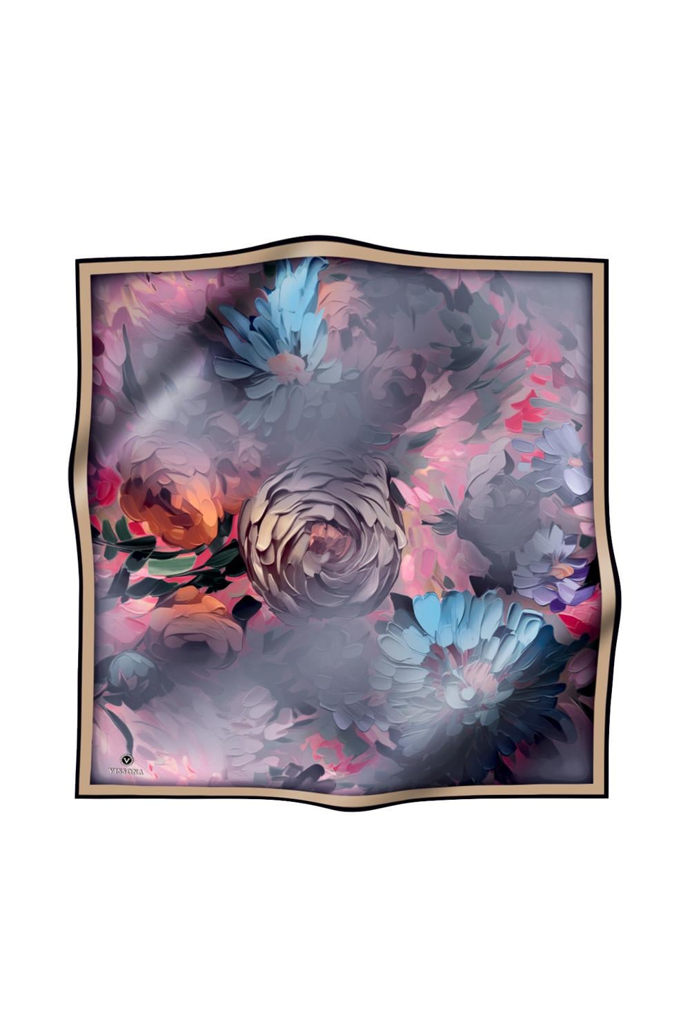%100 Twill İpek Dumanlı Çiçek Desenli Gri - Saks Renkli 90x90 Eşarp Kenar Dikiş Şekli El Dikişli
