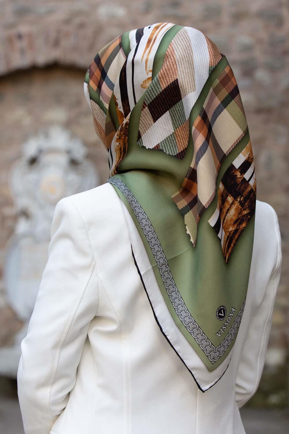 %100 Twill İpek Ekose Desenli Haki - Bakır Renkli 90x90 Eşarp Dikim Şekli : El Dikişi (DGN50494-11)