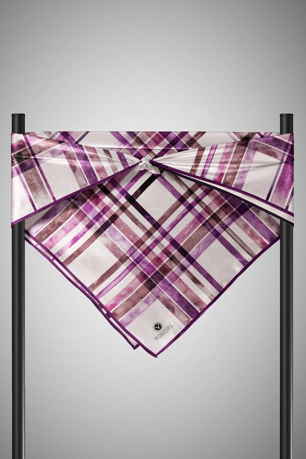 %100 Twill İpek Ekose Desenli Mürdüm - Vizon Renkli 90x90 Eşarp Kenar Dikiş Şekli El Dikişli