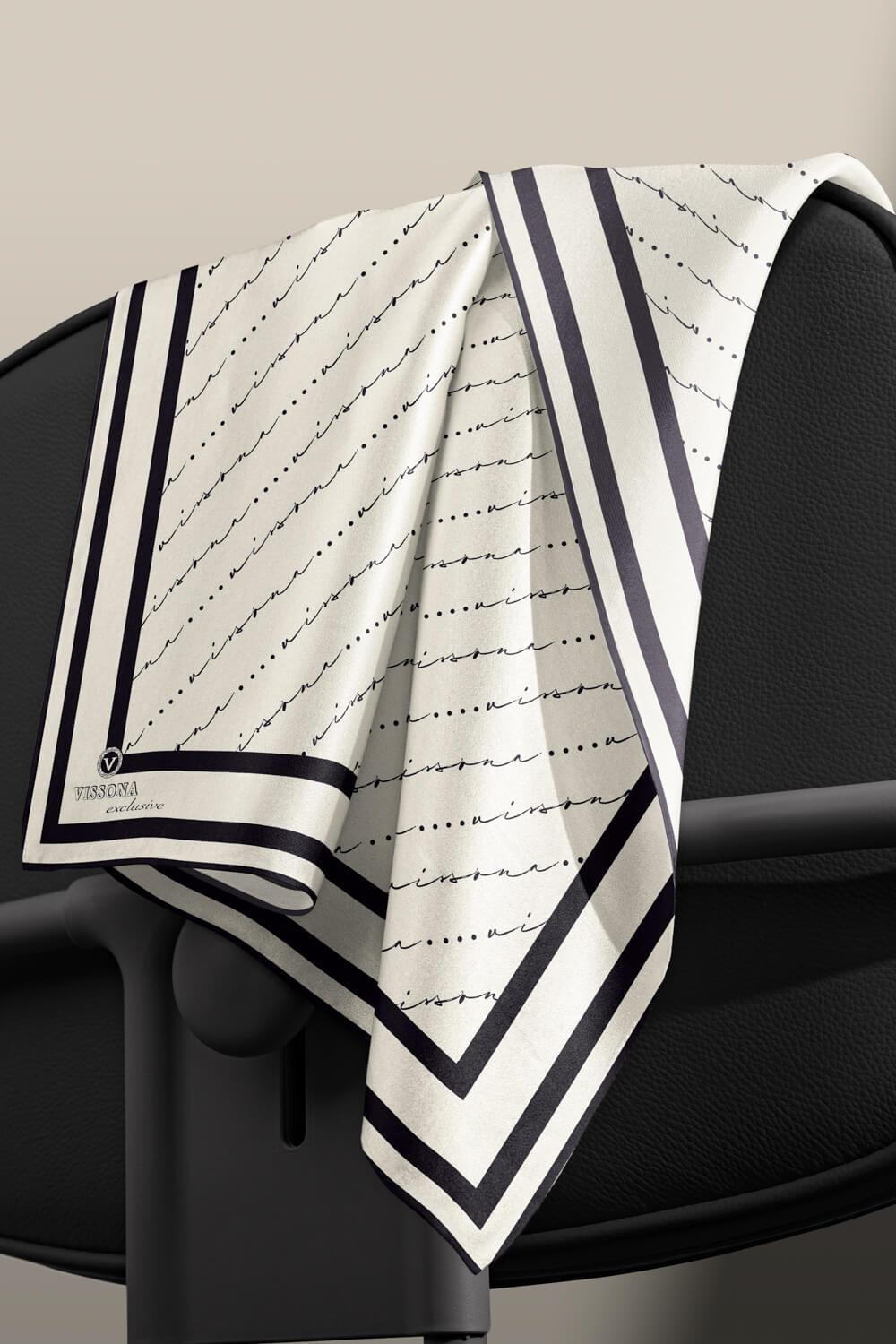 %100 Twill İpek El Yazısı Vissona Desenli Krem - Siyah Renkli Daha Tok Exclusive Serisi 90x90 Eşarp Kenar Dikiş Şekli : El Dikişi