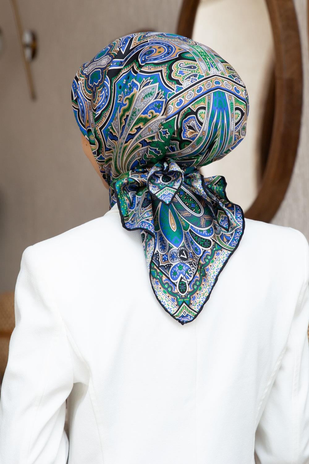 100% Twill İpek Etnik Desenli Saks - Zümrüt Yeşili Renkli 90x90 Dikim Şekli : El Dikişi Eşarp