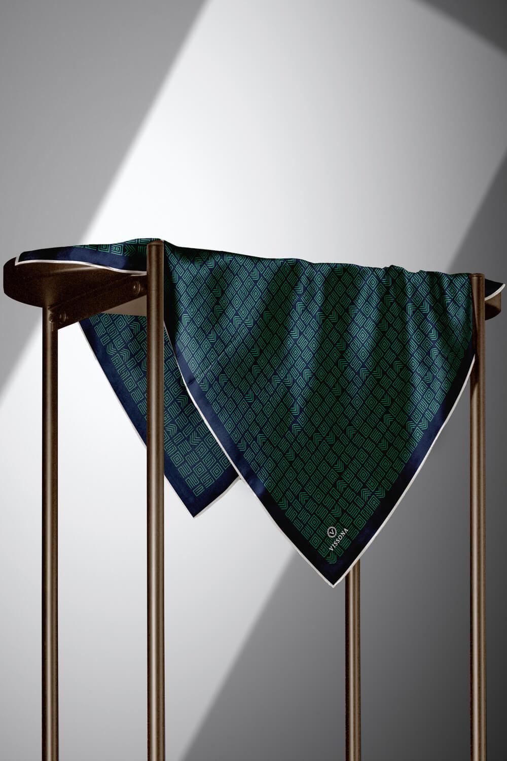 100% Twill İpek Etnik Motif Desenli Zümrüt Yeşili - Lacivert Renkli 90x90 Dikim Şekli : El Dikişi Eşarp