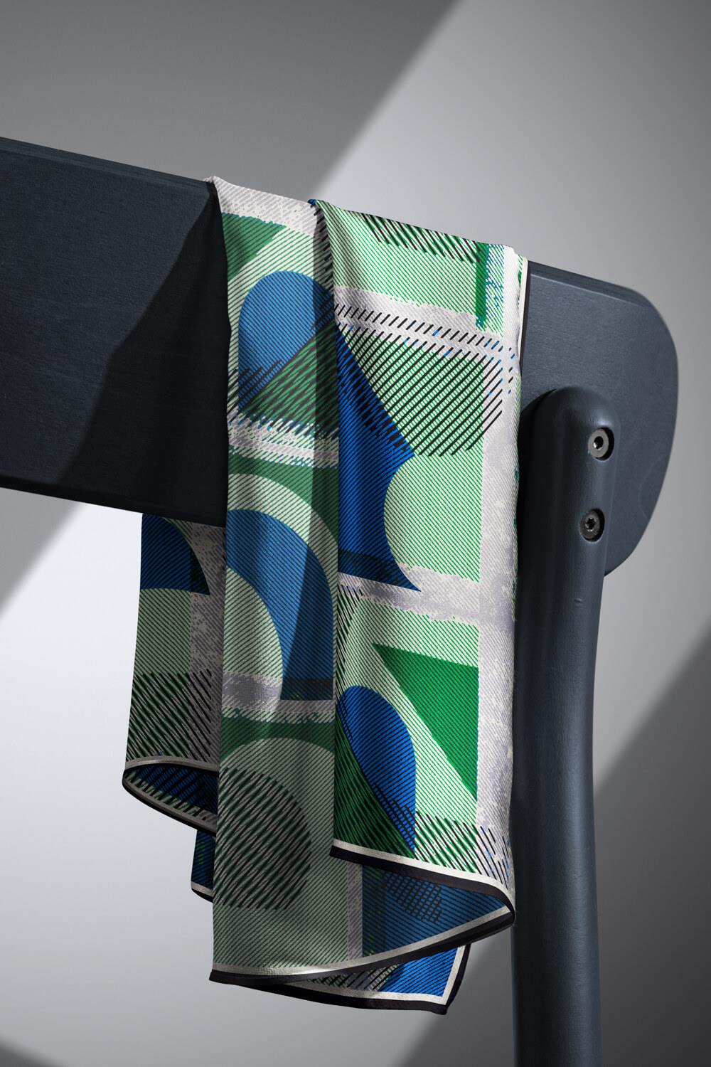 %100 Twill İpek Geometri Desenli Saks - Zümrüt Yeşili Renkli 90x90 Eşarp Kenar Dikiş Şekli El Dikişli