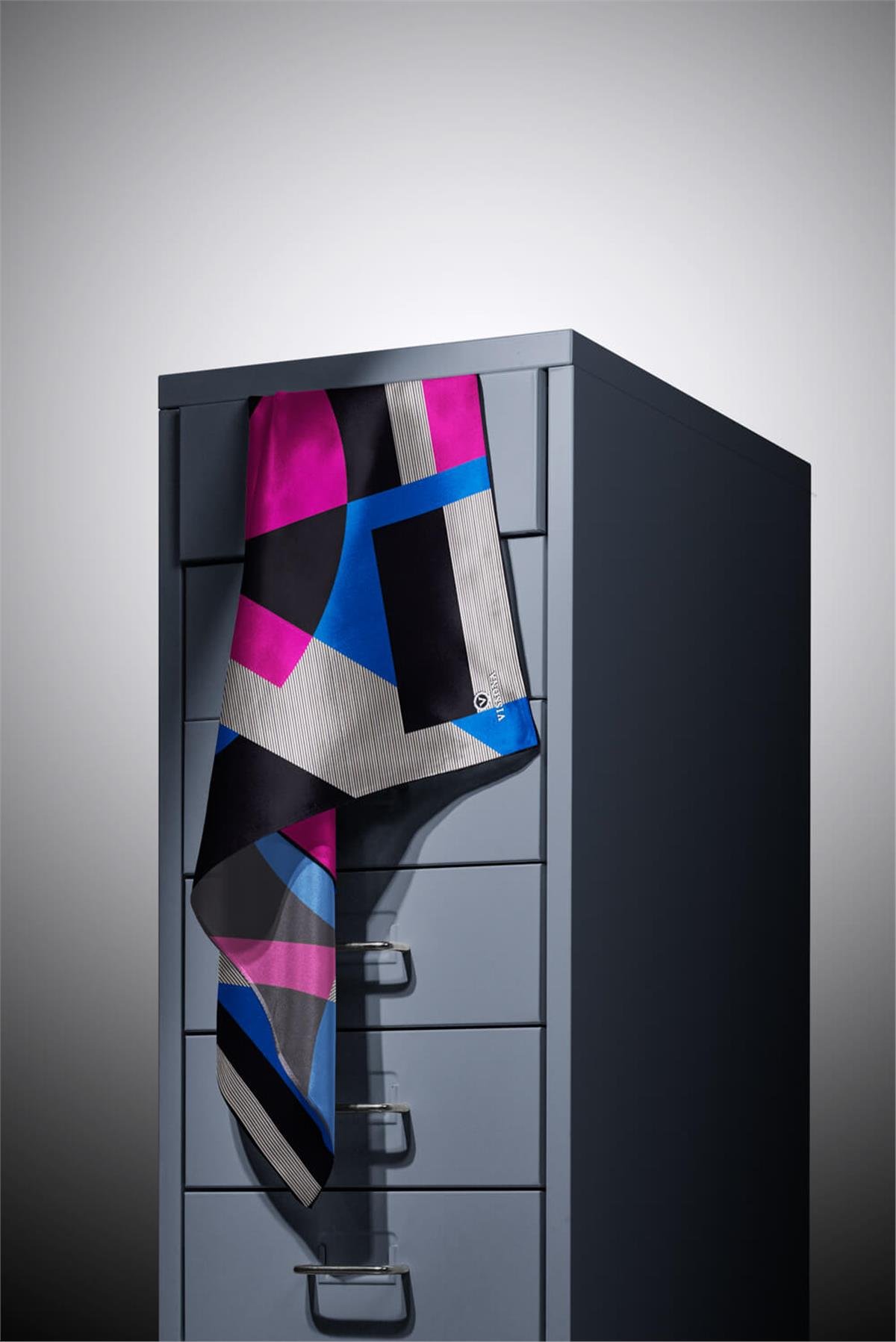 %100 Twill İpek Geometrik Çizgi Desenli Saks - Fuşya Renkli 90x90 Eşarp Kenar Dikiş Şekli El Dikişli (51519-0032-0025)