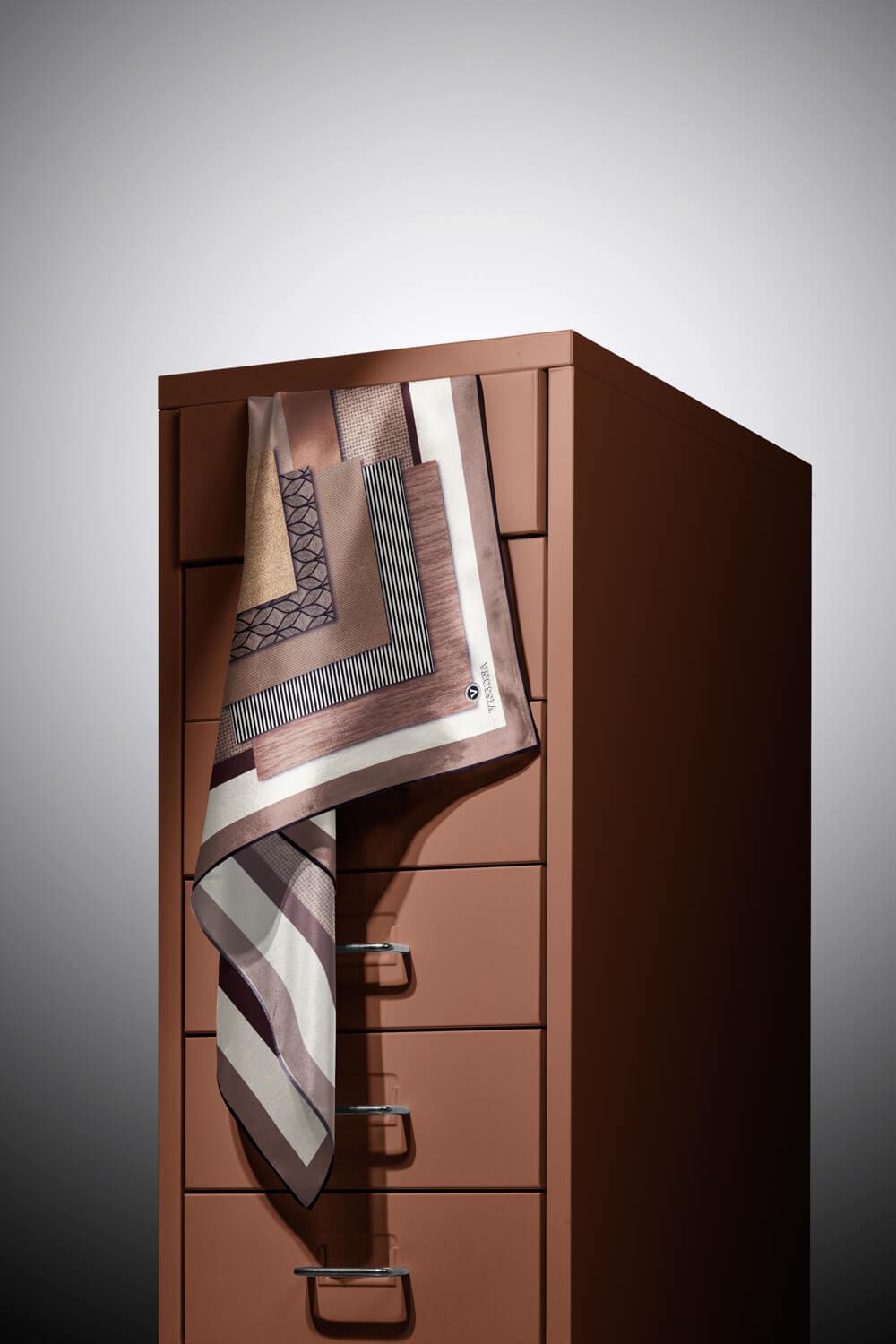 %100 Twill İpek Geometrik Desenli Bakır - Bej Renkli 90x90 Eşarp Dikim Şekli : El Dikişi