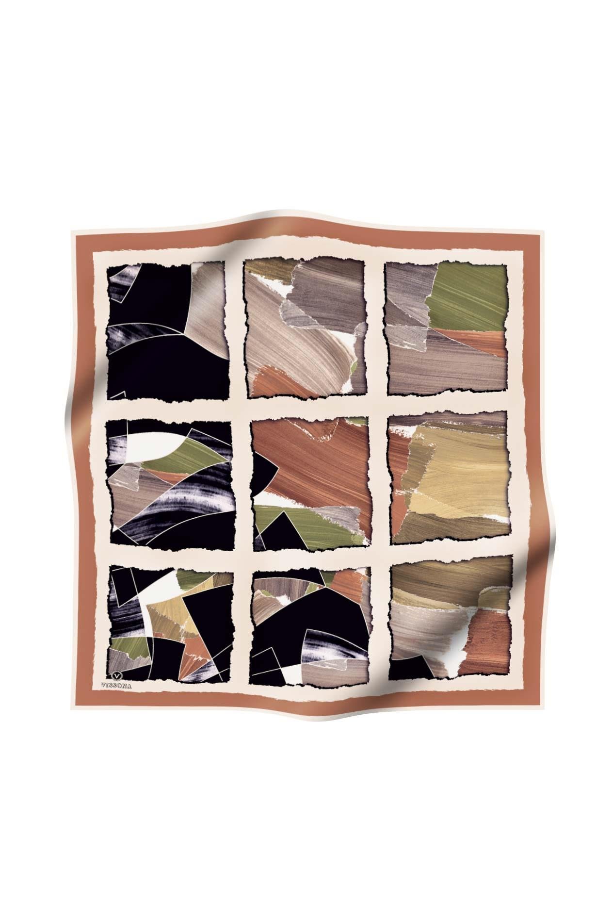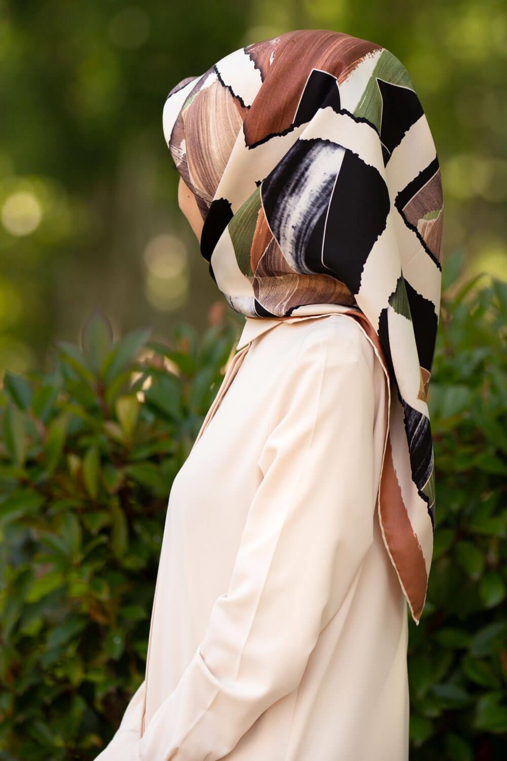 %100 Twill İpek Geometrik Desenli Bakır - Haki Renkli 90x90 Eşarp Dikim Şekli : El Dikişi