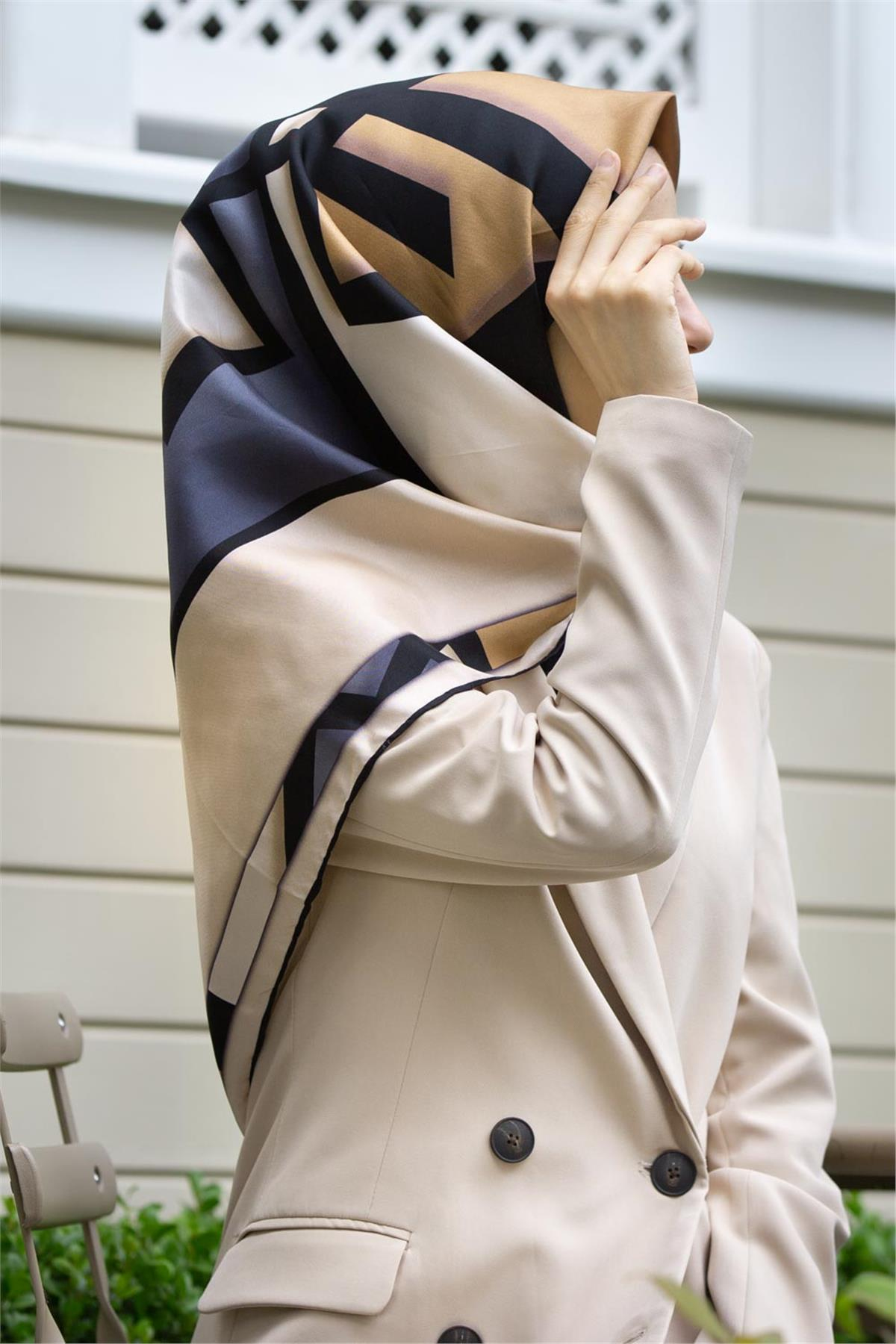 %100 Twill İpek Geometrik Desenli Bej - Gri Renkli 90x90 Eşarp Dikim Şekli : El Dikişi