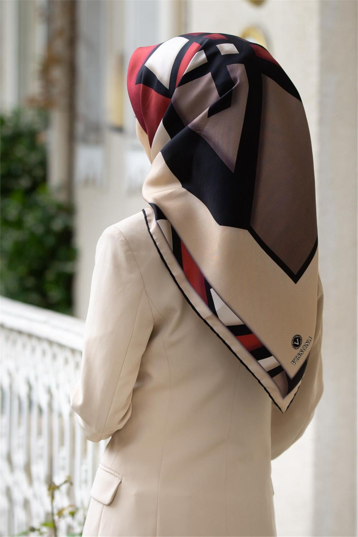 %100 Twill İpek Geometrik Desenli Bordo - Vizon Renkli 90x90 Eşarp Dikim Şekli : El Dikişi (DGN51478-6)