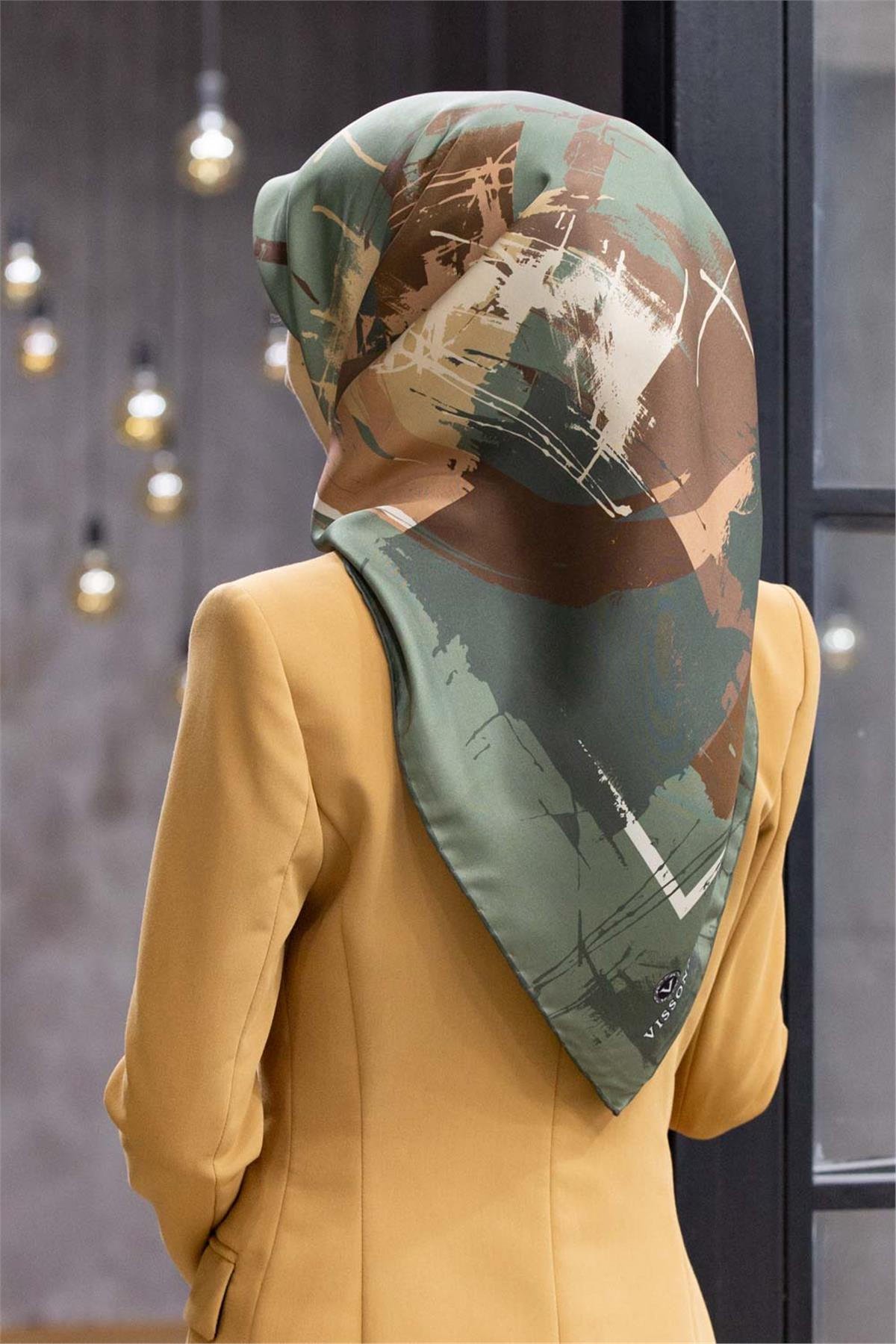 %100 Twill İpek Geometrik Desenli Çağla - Bakır Renkli 90x90 Eşarp Dikim Şekli : El Dikişi (DGN50788-10)