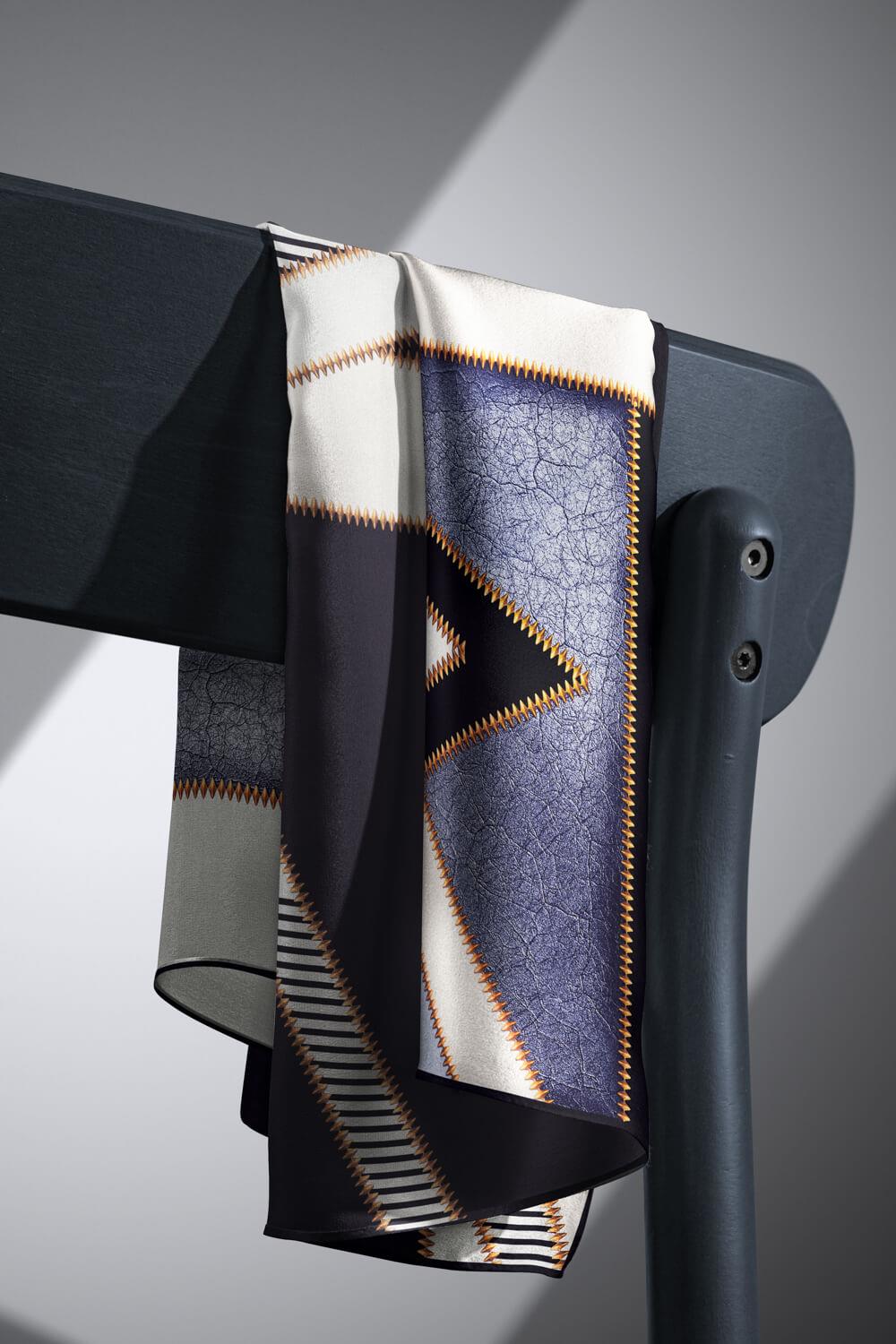 %100 Twill İpek Geometrik Desenli Gümüş - Siyah Renkli 90x90 Eşarp Dikim Şekli : El Dikişi
