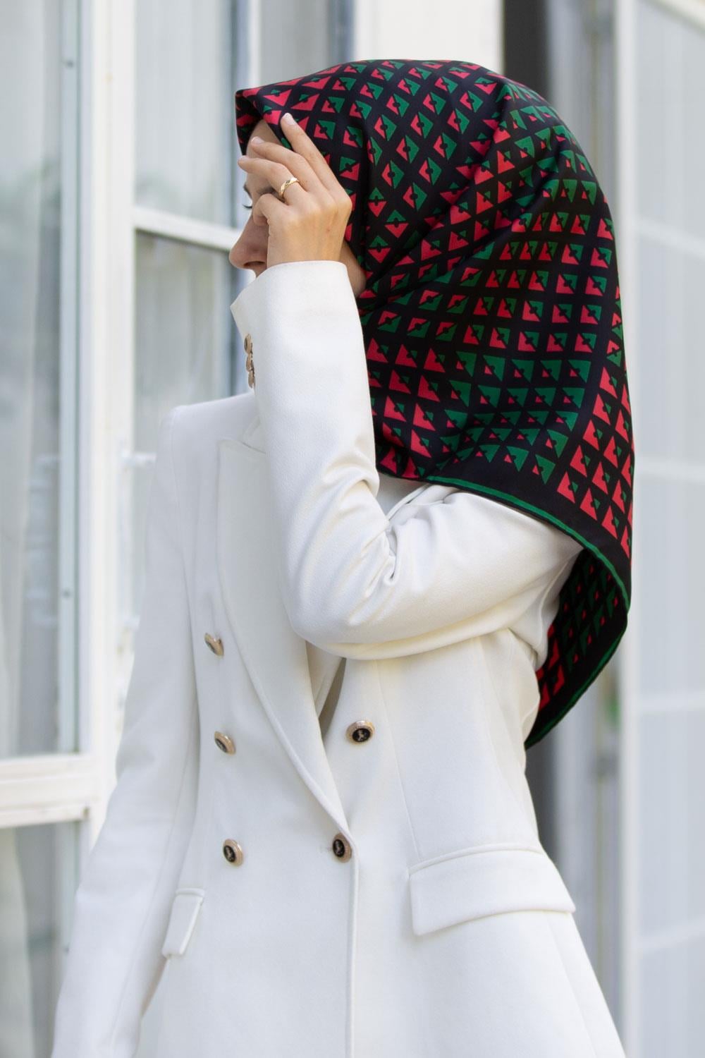 %100 Twill İpek Geometrik Desenli Kırmızı - Zümrüt Yeşili Renkli 90x90 Eşarp Dikim Şekli : El Dikişi