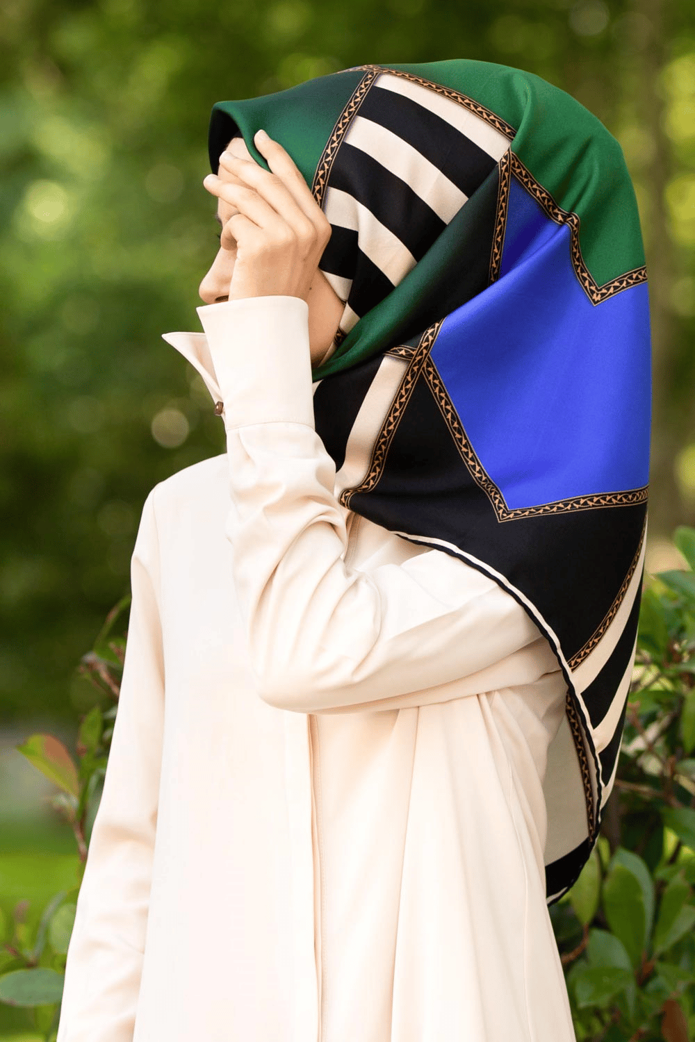 %100 Twill İpek Geometrik Desenli Saks - Zümrüt Yeşili Renkli 90x90 Eşarp Dikim Şekli : El Dikişi