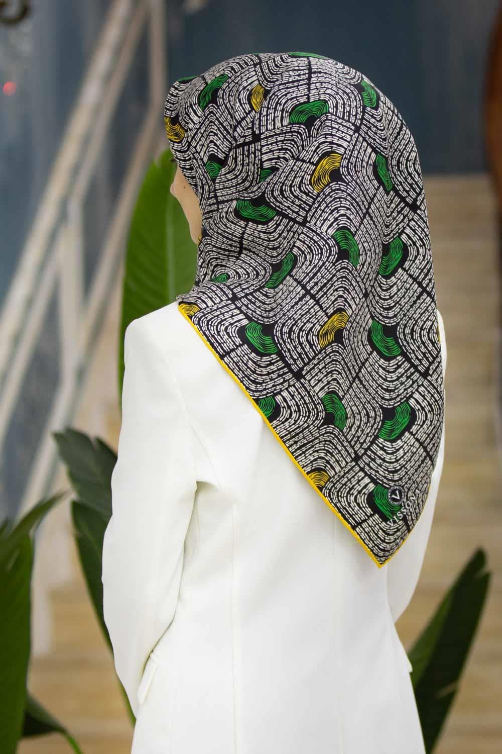 %100 Twill İpek Geometrik Desenli Sarı - Siyah Renkli 90x90 Eşarp Dikim Şekli : El Dikişi