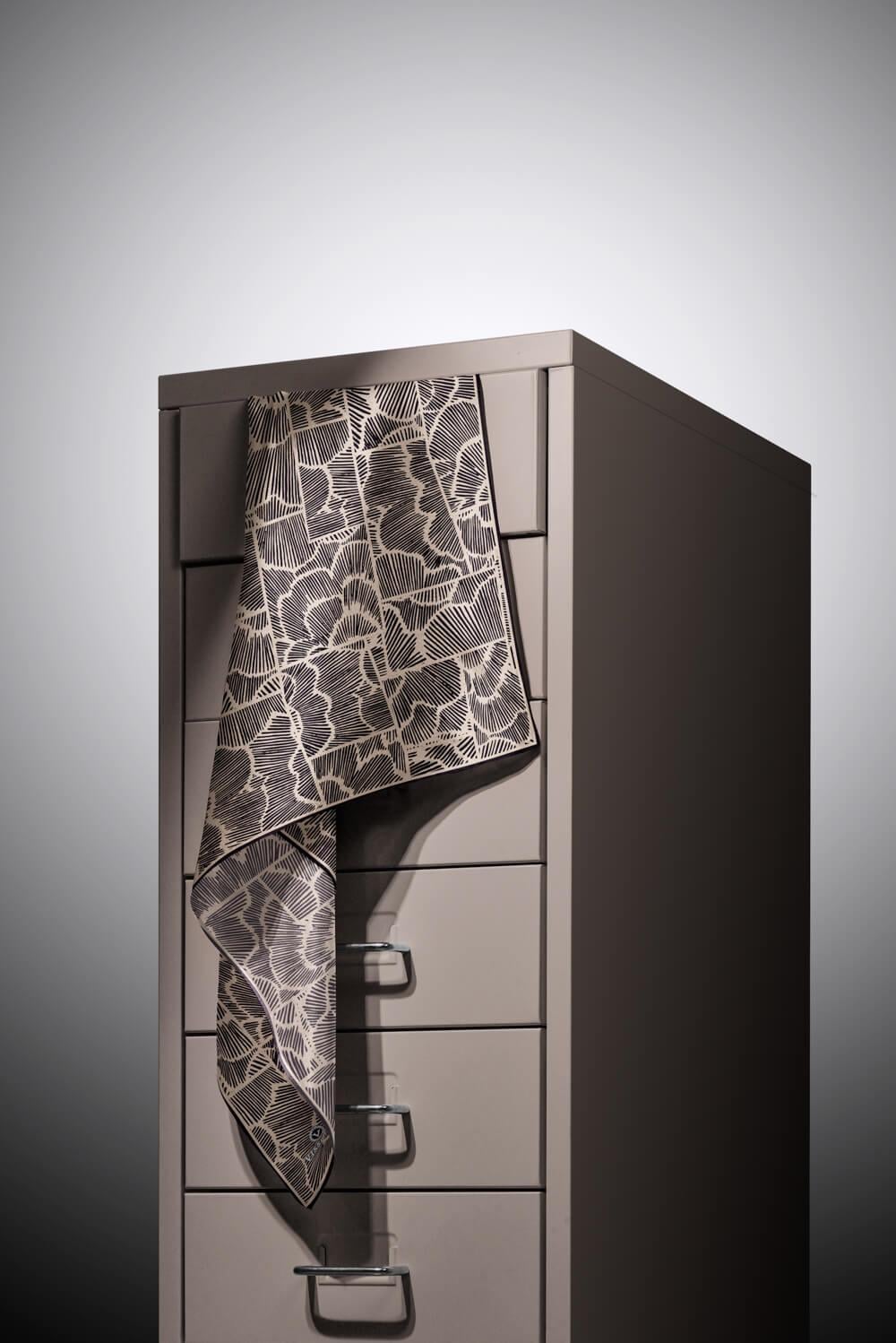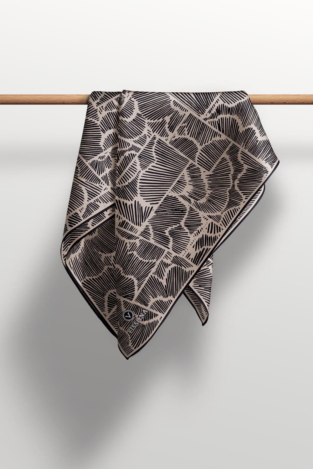 %100 Twill İpek Geometrik Desenli Siyah - Bej Renkli 90x90 Eşarp Dikim Şekli : El Dikişi