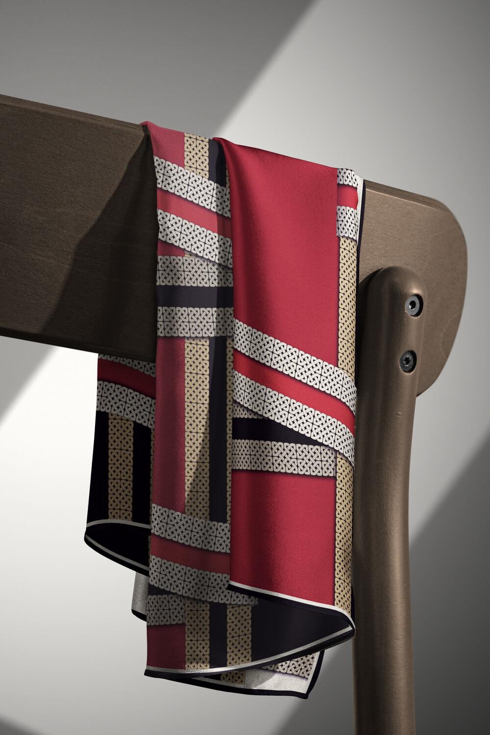 %100 Twill İpek Geometrik Desenli Siyah - Bordo Renkli 90x90 Eşarp Dikim Şekli : El Dikişi (10675-4)