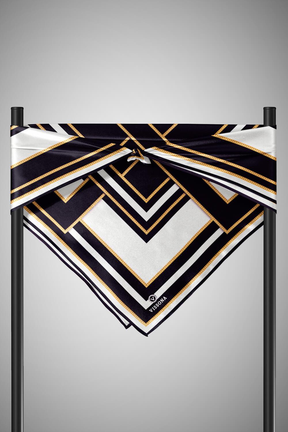 %100 Twill İpek Geometrik Desenli Siyah - Krem Renkli 90x90 Eşarp Dikim Şekli : El Dikişi